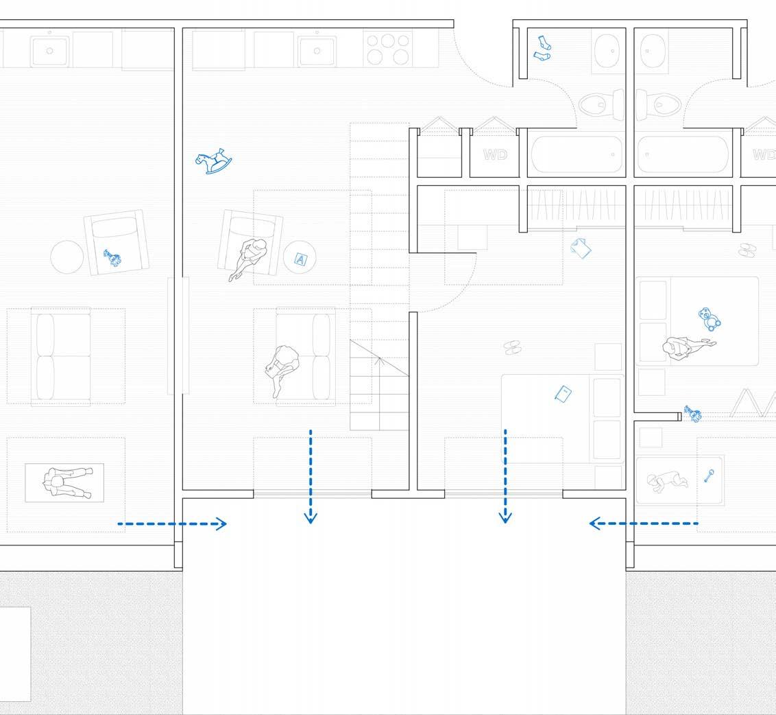 A micro-community eye is formed for families with younger kids who need more attention. Sloped surfaces and shared collective spaces create unintentional glances onto children’s activities. This integrates play and childcare into the fabric of communal housing and living rather than being an individual responsibility.