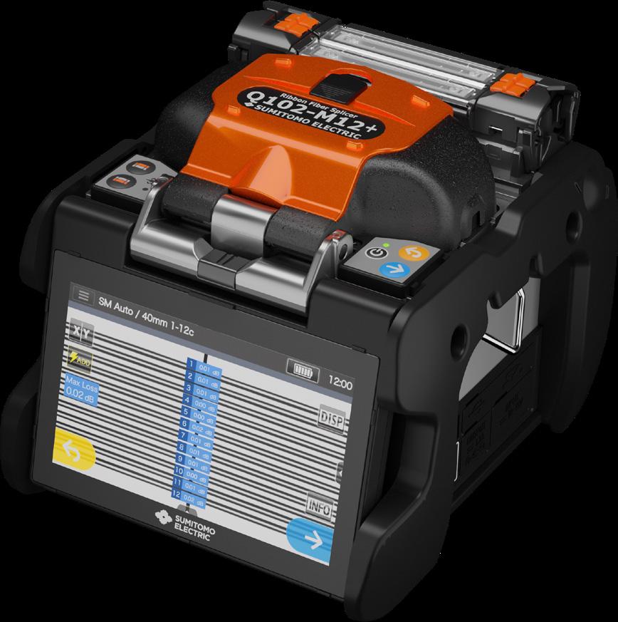Quantum Q102-M12+ Ribbon Fiber Splicer Kit with Dual Built-in Heat Shrink Ovens, Shipping Case, one set of Spare Electrodes (ER-10), Cooling Tray, AC Interface/ Battery Charger with Power Cord, Battery Unit (BU-102), Fiber Protection Sleeves (FPS-6), V-groove Cleaning Brush (VGB-004), Cleaning Kit (FUS-CLN-KIT)