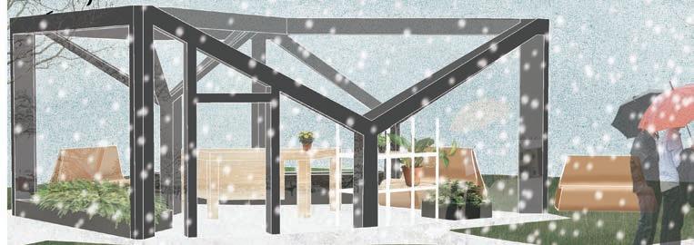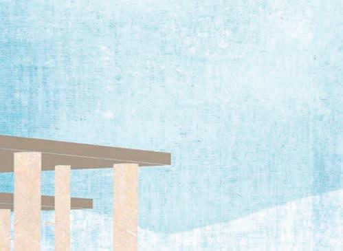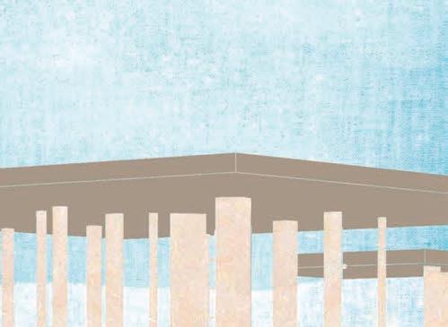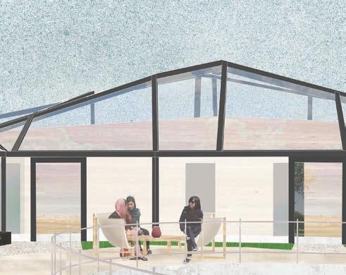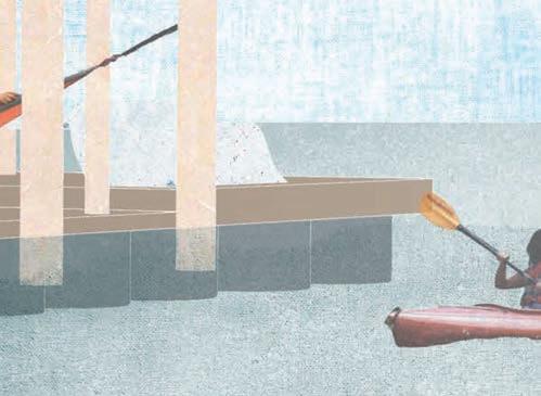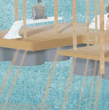 The Floating Pavilion provides a serene resting spot for paddleboarders and kayakers on Gravel Pond, situated just below Chatfield Reservoir. Designed to adapt to the reservoir’s fluctuating water levels, the pavilion floats on the pond’s surface, seamlessly moving with the water and harmonizing with the natural environment. It works with nature instead of against it to create a fun and calming environment for the users. Located between the paddleboard rental store and the scenic foothills, it creates a calming and enjoyable space for users. To access the pavilion, visitors must paddle out, offering an opportuni-