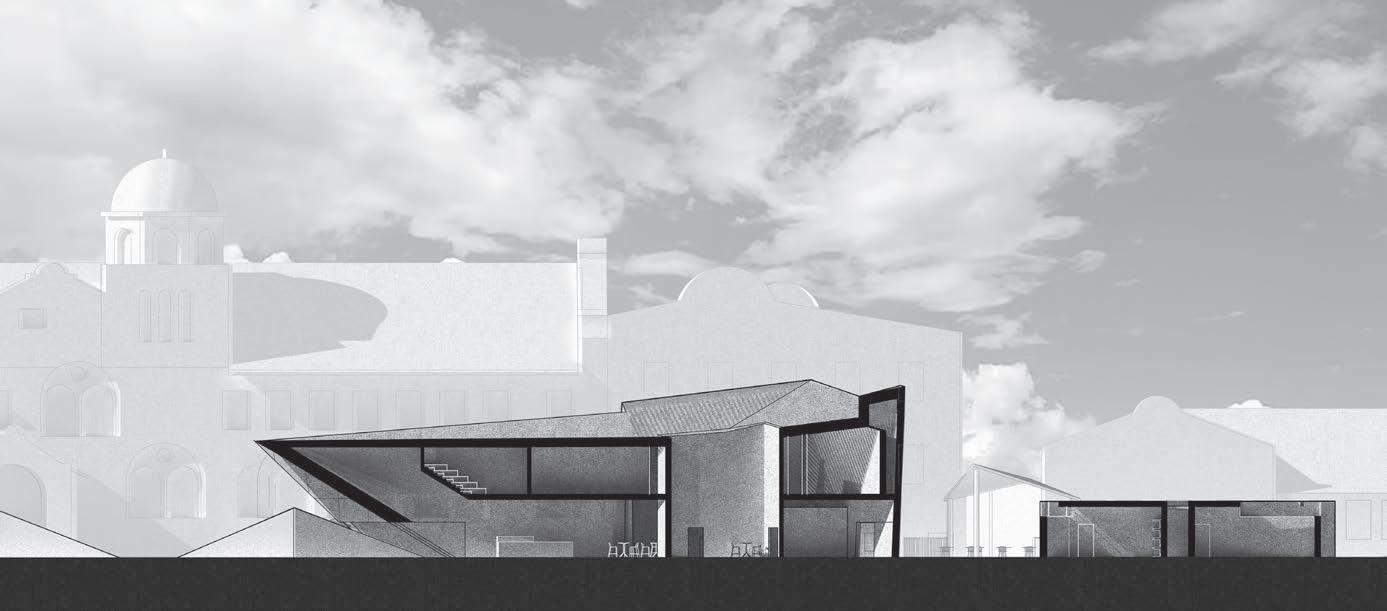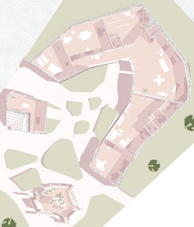 The stereotomic subtractions in the stone pavilions create thresholds and curate views to the garden, while the tectonic assembly blurs the boundary between inside and outside, allowing light to filter through.