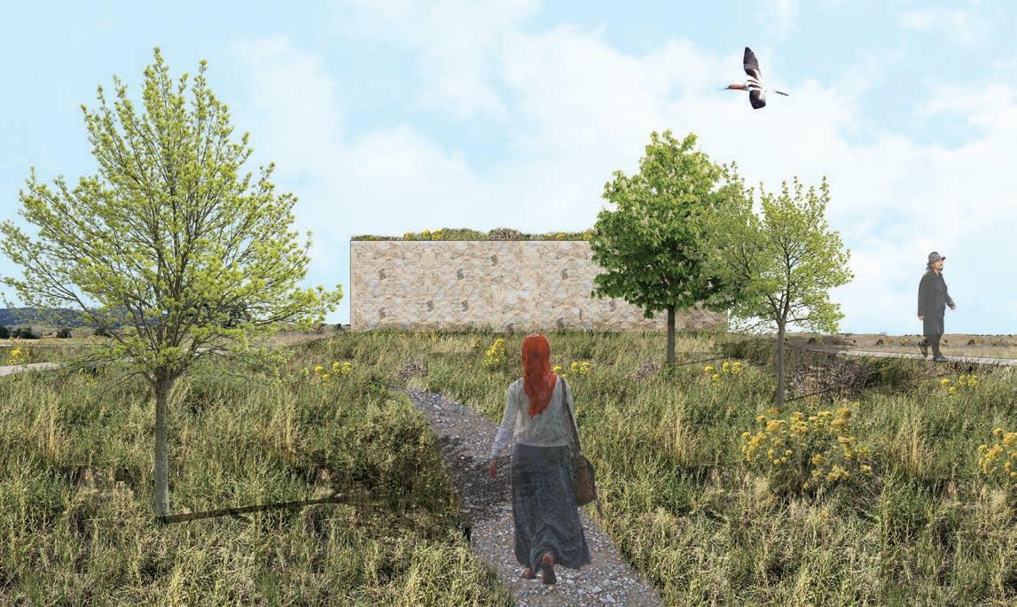 The solid, grounded nature of the stone structures creates a harmonious contrast with the three lighter structures: a water pavilion, a greenhouse, and a visitor center. The pavilion and greenhouse are airy, open spaces that highlight the aquatic garden and desert plants, while the visitor center features a glass façade with small diameter timber screening that changes in porosity. The combination of stone and black steel elements creates a striking contrast