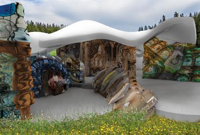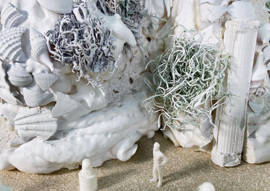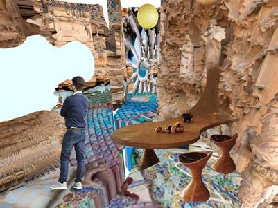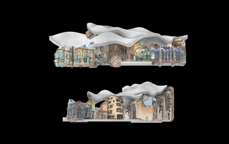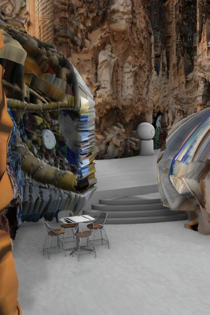 --summer albouy — issue 2022 --What really is, and what is not? This collection of collaging warps and merges reality and fiction: the rose window theaGüellfoundcolourfulskylights,becomesabenchatParkbecomesramp,andornamental figures from La Sagrada Família’s portal becomes a gritty grotto as it lines the walls. thetextureofexperimentationAnmaterialityandbeginsformationof the final project, while drawing these elements from Gaudí. gallery of grottoes — ug4 18 19