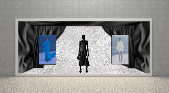The texture and shine of the aluminium backdrop really speaks to the futuristic aesthetic of the fall/winter collection and starkly contrasts with the black patent leather drapes as well as the clothes on the toBalenciagamannequin.tendshaveavery clean look, and accompanied with my personal touch from my toaddsbrand’stoplasterbackground,architectureutilisingcolumnsshowcasethenewbagsmorecuriositytheaesthetic.