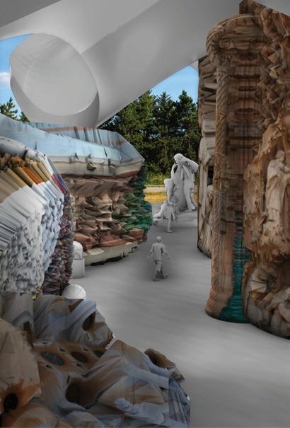 The weirdness and ornamentality taken from the original materiality of Gaudí’s works is utilized in the structural components of the gallery itself, shaping the walls of the different programs. With the help of displacement mapping, these materials become alive and begin to poke out into the galleries, creating grottolike structures and walls to house the artwork in. While this project was unlike any other I’ve ever worked on, it was the most fascinating and experimental journey I’ve been on — I hope this shows through in my work. gallery of grottoes ug4