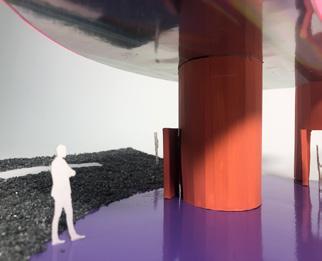 projection mapping their curves onto our pavilions to create graphical shapes. Alluding to the wavy graphics on the exterior of my pavilion, the stands in which the chairs would be showcased on sat on a curvy wave, which can be viewed by visitors streaming in and out through both sides of the structure.