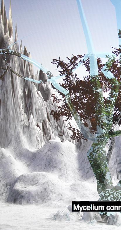 This image is a still from Ella’s two minute film ‘Forest Virus.’ It features a broken virtual forest originally created for a virtual reality headset, overlaid with scientific and folkloric subtitles. It was inspired by an article which described the forest’s communication network using digital metaphors; calling it an ‘underground fungal internet’ known as the ‘Wood Wide Web’. Forests even have their own version of ‘cybercrime’, attacking intruders with ‘viruses’. The digital forest steadily decays and the subtitles slip between fact and folklore as though delirious with the ‘virus’ they describe.