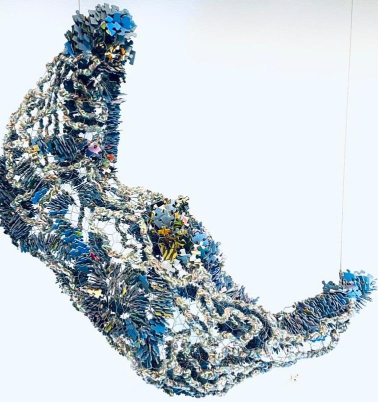 Robelis Rodriguezuez Mijare is a German mixed media artist situated near Düsseldorf. Robelis’s work is made from recycled materials. The Rebirth of the Earth is made using chicken wire from her garage and discarded puzzle pieces that she saved from the rubbish. She crocheted directly on the wire and embroidered it with small crystals.