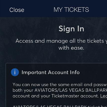 Sign in to your ticket account using your Aviators Account Manager email and password. Please note you can now use the same email and password for both your Las Vegas Aviators/Las Vegas Ballpark ticket account and your Ticketmaster account.
