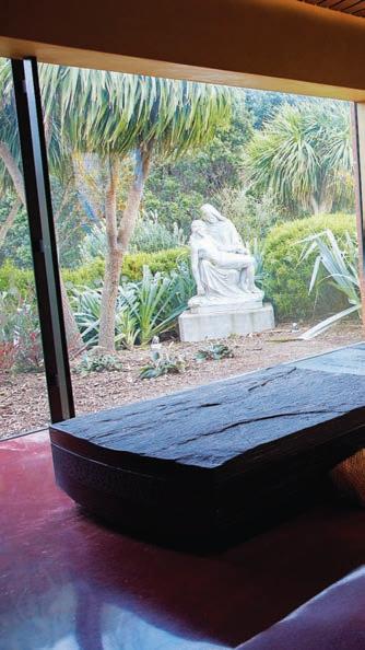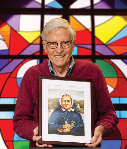 Opposite page: Information about Suzanne Aubert, and Father Maurice’s positio. Centre: Suzanne Aubert’s final resting place at the Sisters of Compassion in Island Bay, Wellington. Above: Father Maurice with a portrait of Suzanne Aubert.