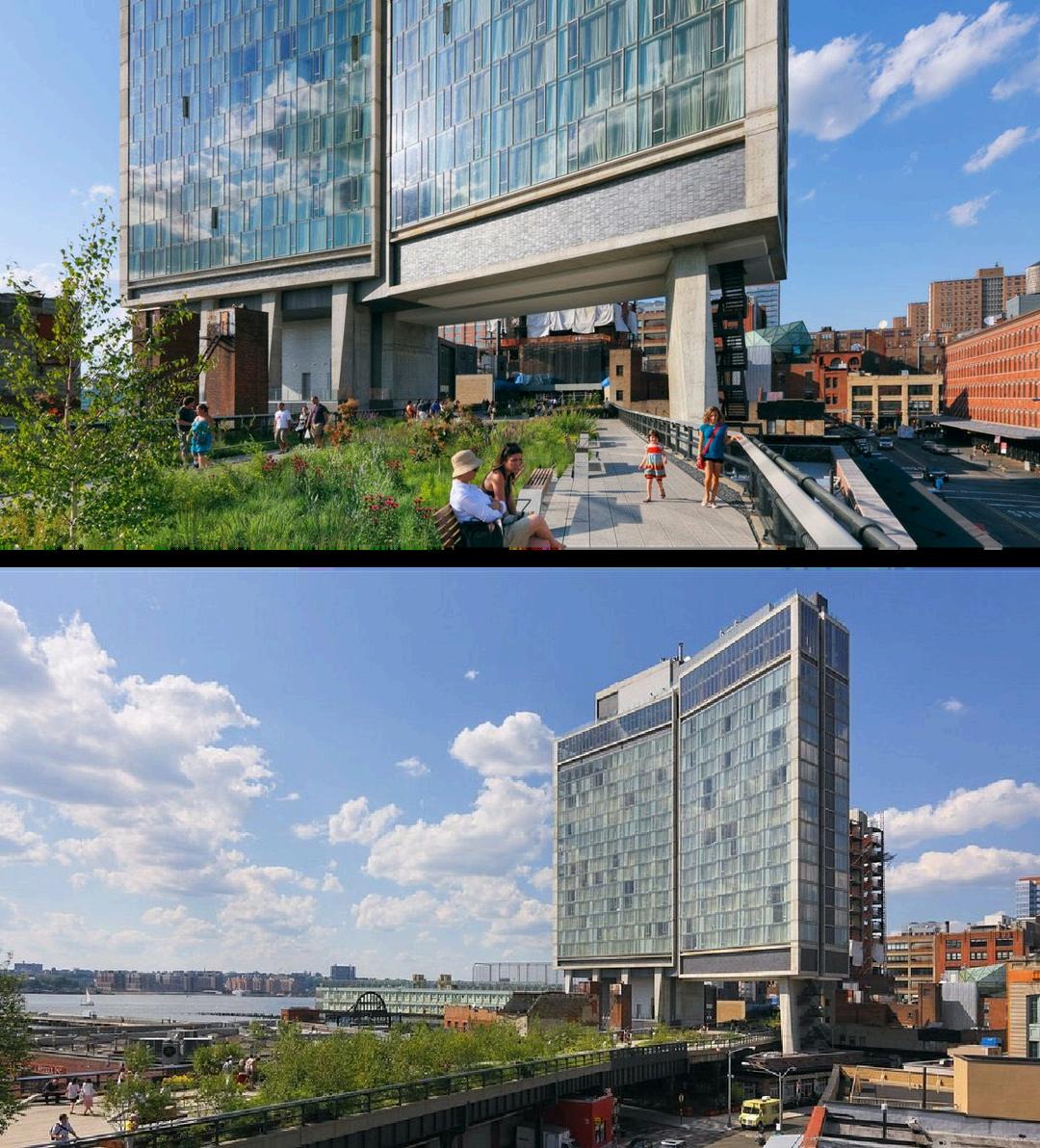 Ground-level permeability is preserved — the High Line remains continuous, readable, and dominant as urban infrastructure.