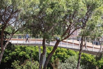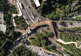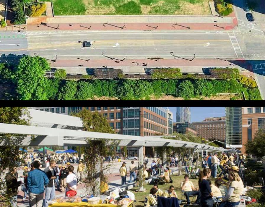 The plaza operates as a habitable bridge, transforming a former traffic-only crossing into a pedestrian-first urban connector over I-75/85. Instead of reading as infrastructure, the deck becomes public ground people experience it as plaza space, not a highway bridge. The intervention reconnects two disconnected urban fabrics: Academic core (Georgia Tech campus) Innovation/commercial district (Tech Square) Pedestrian movement is choreographed as a sequence, not a shortcut: campus edge planted forecourt bridge-plaza urban arrival Landscape elements (trees, planters, seating) mask the scale and noise of the interstate, psychologically compressing the highway and expanding the pedestrian realm. Seating edges and widened sidewalks encourage lingering, converting what was once a transition zone into a destination. Views across Midtown are deliberately framed, while downward views to traffic are softened — shifting perception from infrastructure to urban room. The plaza works as a social condenser: students crossing between classes researchers moving between buildings informal meetings outdoor study and pause zones Lighting, paving texture, and street furniture establish a distinct identity, signaling arrival into Tech Square while maintaining continuity with campus character.