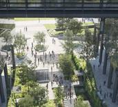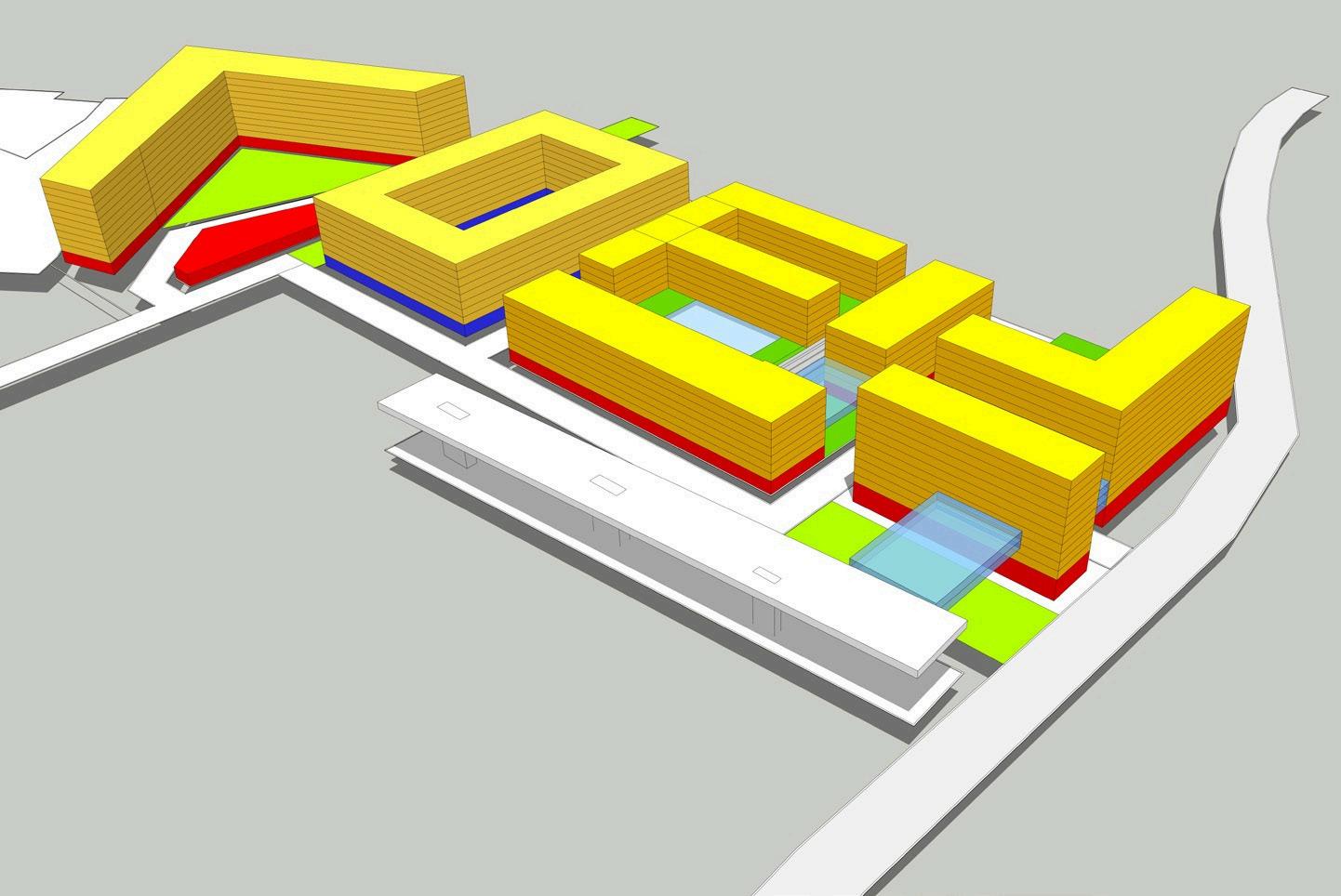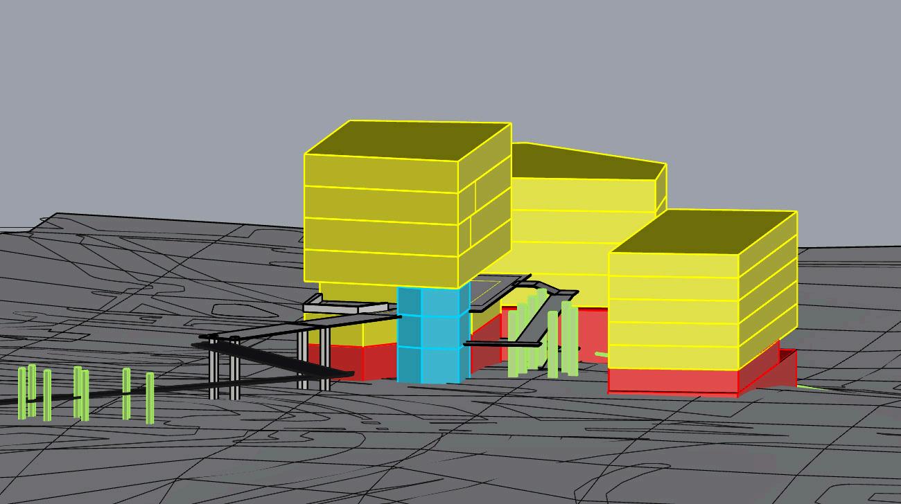 The hotel mass is lifted above grade, creating a clear pedestrian corridor where the park flows uninterrupted — architecture yields to public movement.