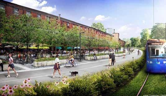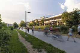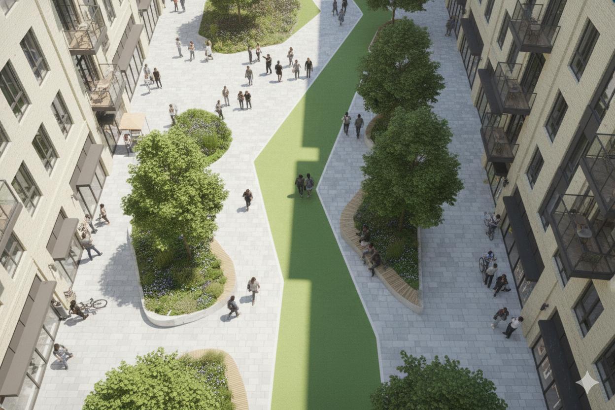 sidewalks, seat walls, lighting, planted landscape area, and bike lines
