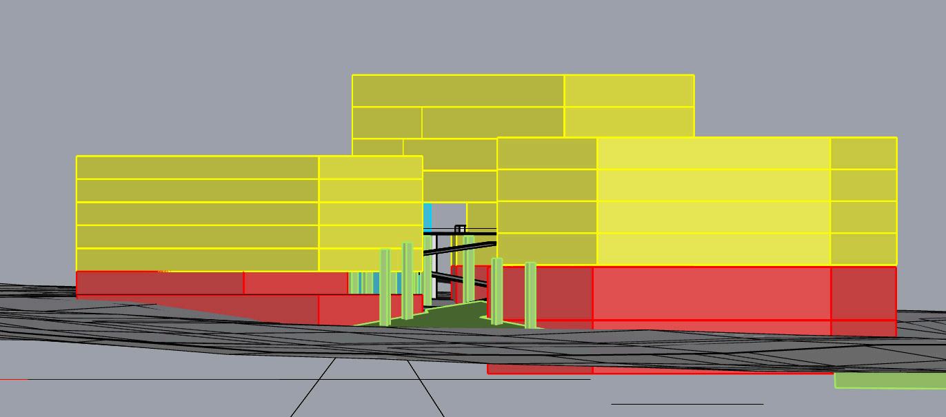 The underside of the hotel becomes an urban room: framed views controlled shadows acoustic softening intimate scale before opening back into wider park segments.
