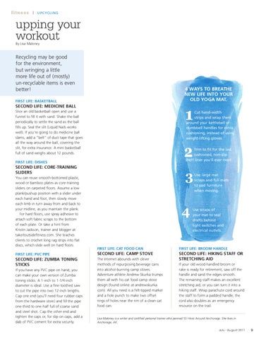 Second Life: Medicine Ball Slice an old basketball open and use a funnel to fill it with sand. Shake the ball periodically to settle the sand as the ball fills up. Seal the slit (Liquid Nails works well). If you’re going to do medicine ball slams, add a “belt” of duct tape that goes all the way around the ball, covering the slit, for extra insurance. A mini basketball full of sand weighs about 12 pounds.