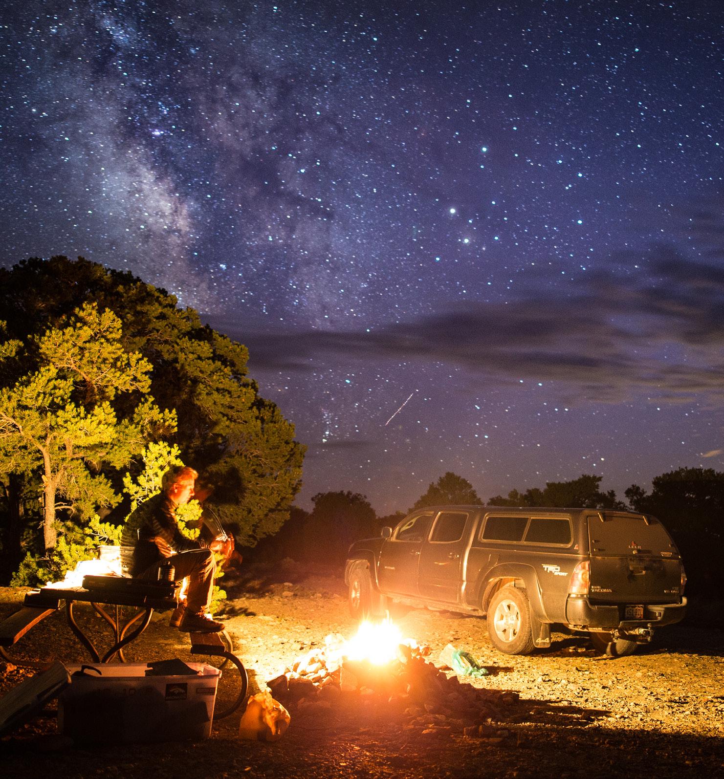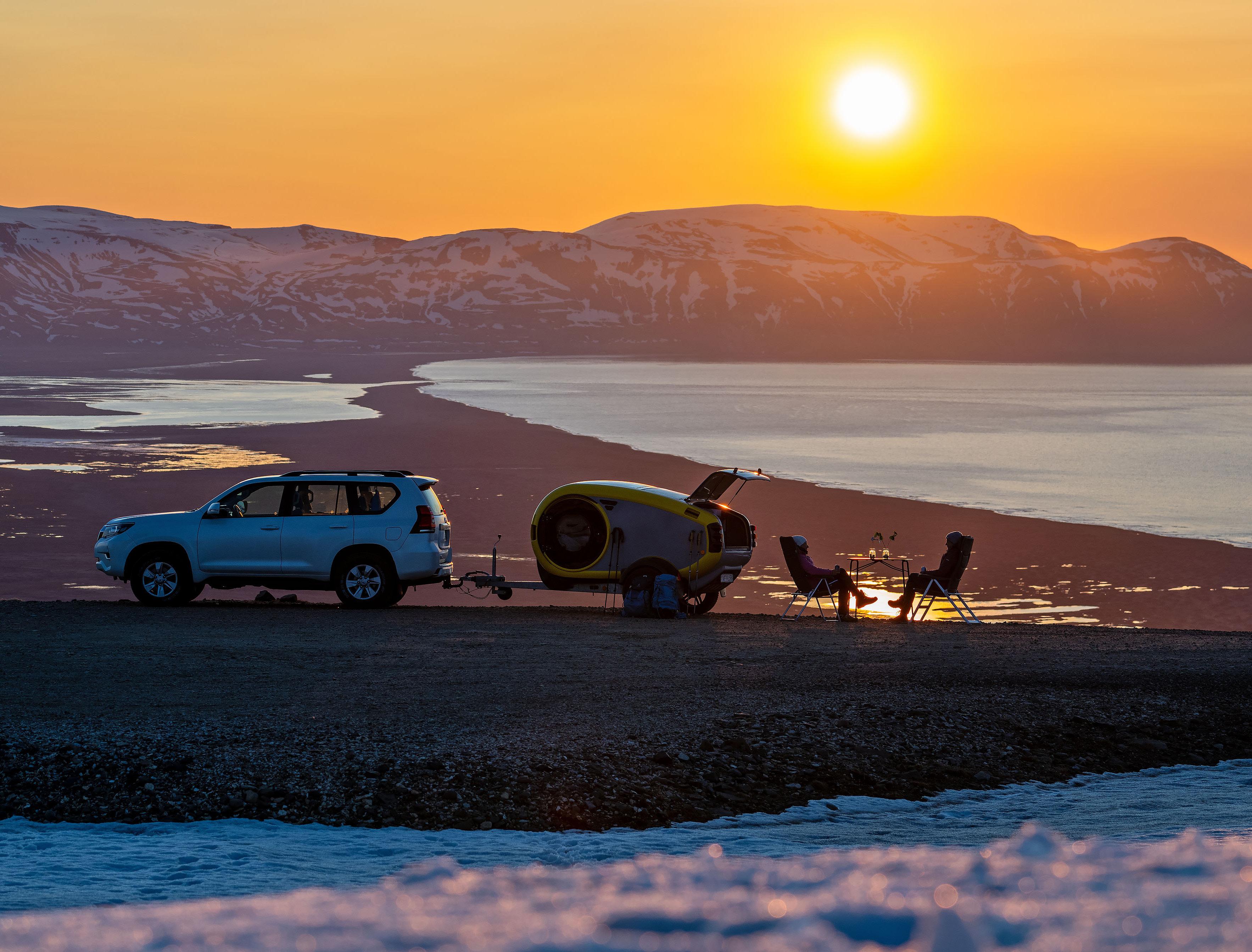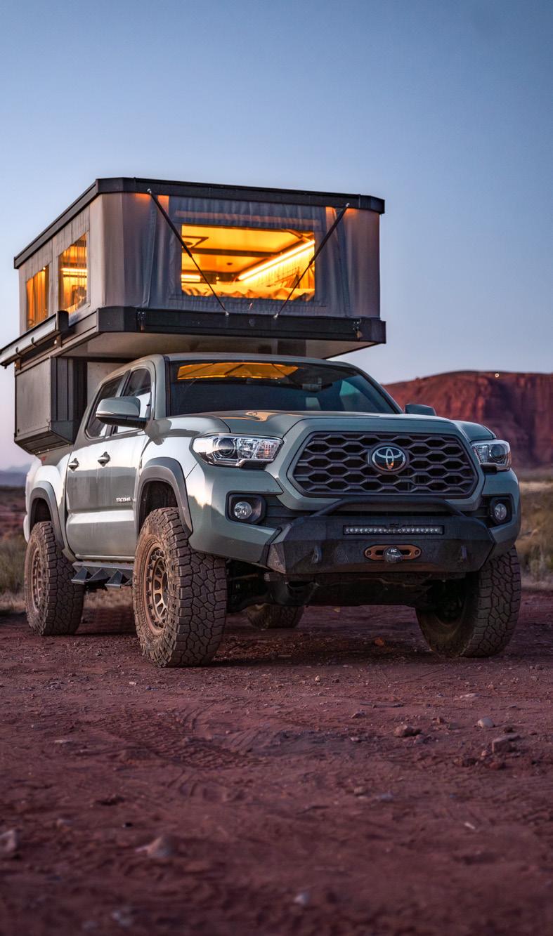 Connor Scalbom chillaxes at sunset in a self-portrait in front of his Tune M1 truck camper in Mammoth, California. By