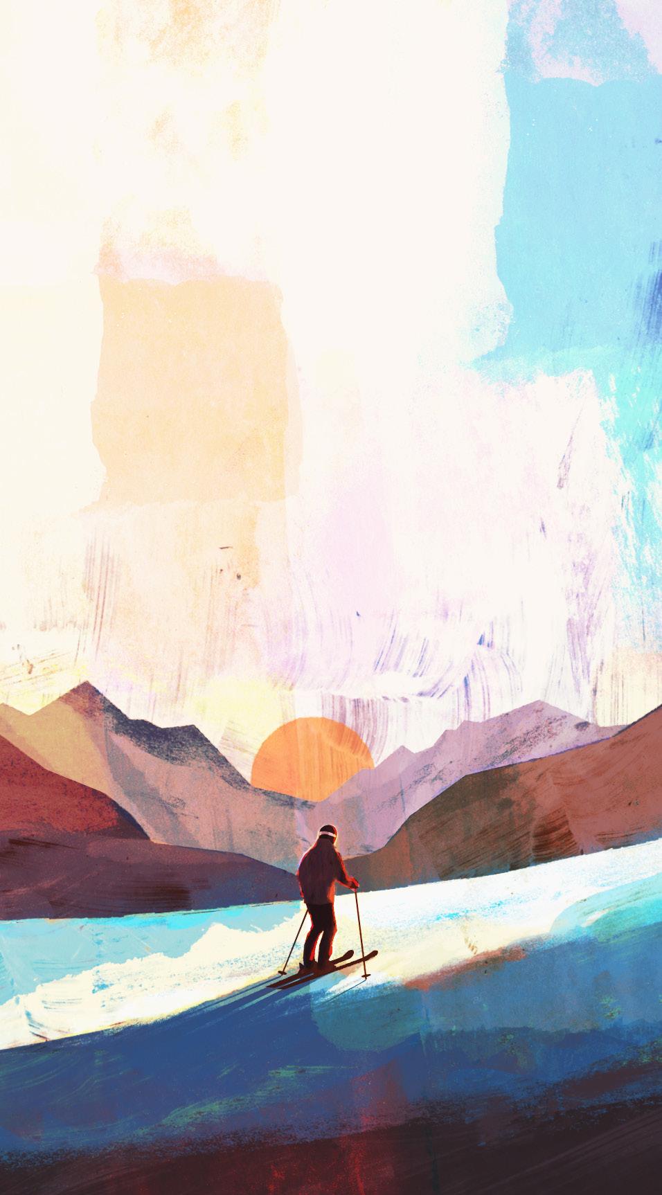Mention Eldora’s Nordic trails to anyone who has skied on them and you will get the same reaction—they go straight uphill. This is true and it’s exactly why I like skate skiing at my local hill so much. These trails get your heart rate up from the first few pole plants and they don’t let up from there. And over the past few years of collective grief and challenge, I have learned to love the relentless beauty of skiing here (especially on Friday mornings when my wife and I make it our ritual to head up together). The rough effort of simply breathing, of pushing off to glide uphill, the pounding of my heart in my ribs, that sharp bite of cold air in open lungs— it all makes me feel fully alive and connected to the best part of myself. This is the draw of any cardio sport. Your initial concerted effort turns into a rhythm and the joy of deep breathing fueling the blood and big muscles of your legs in a silence only interrupted by the squawks of a Canada jay. This bre ath-focused movement is a welcome medicine against the crush of this world, of public news of wars and politicians sowing discord, of our private pains, loss, loneliness, and financial uncertainty. Out here, we can exist in our purest form—if only for the time it takes us to drive out of cell range. After enduring a mass shooting and an apocalyptic wildfire fueled by jet force winds here in Boulder, the chance to really inhale and exhale refocuses us back on the things within our control.