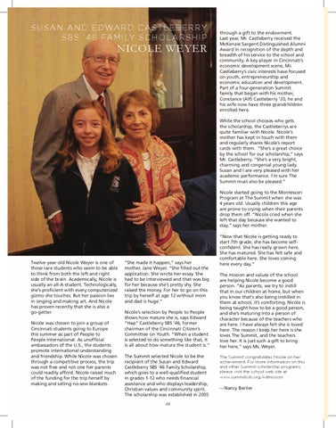 “She made it happen,” says her mother, Jane Weyer. “She filled out the application. She wrote her essay. She had to be interviewed and that was big for her because she’s pretty shy. She raised the money. For her to go on this trip by herself at age 12 without mom and dad is huge.” Nicole’s selection by People to People shows how mature she is, says Edward “Hap” Castleberry SBS ’46, former chairman of the Cincinnati Citizen’s Committee on Youth. “When a student is selected to do something like that, it is all about how mature the student is.” The Summit selected Nicole to be the recipient of the Susan and Edward Castleberry SBS ’46 Family Scholarship, which goes to a well-qualified student in grades 1-12 who needs financial assistance and who displays leadership, Christian values and community spirit. The scholarship was established in 2005 48