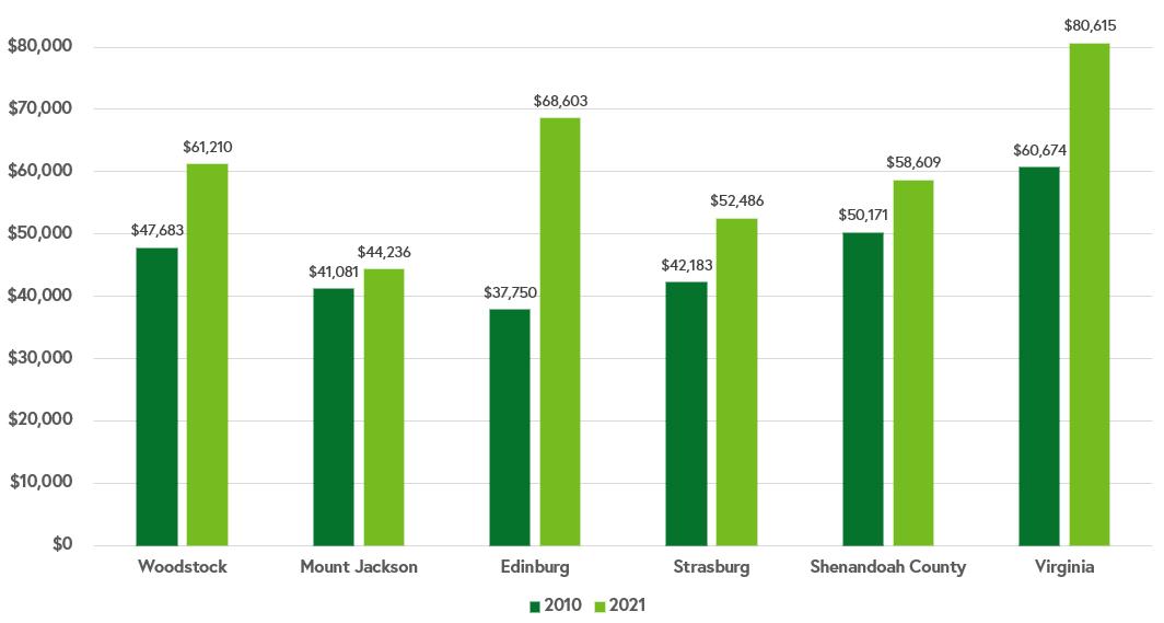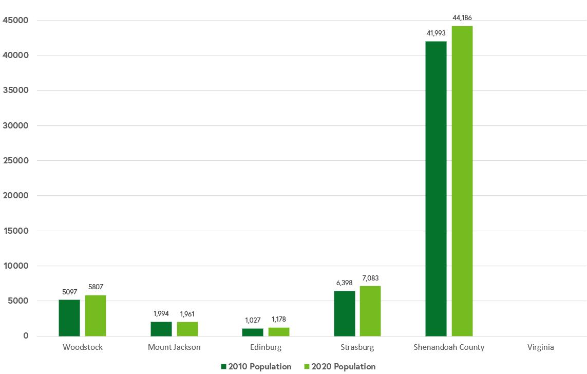 The graph below shows population change by percentages between the 2010 and 2020 Decennial Census with comparisons to other neighboring and rural localities in the region. Woodstock’s changed at a similar percentage as Strasburg and Edinburg, showing that over 10% growth has occurred in the last ten years, or on average 1% of growth per year. With neighboring localities experiencing similar growth, the region is evidently attracting many new residents.