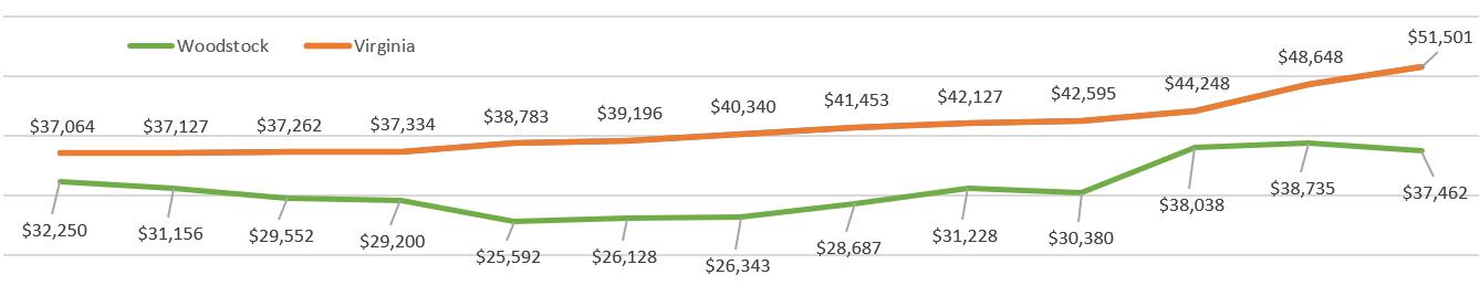 The graph above shows the Town’s population increase since the beginning of the 1900s. Notably, the population has grown almost every census of Woodstock’s history, particularly through the middle of the 20th century. Across Virginia, many small towns are struggling with the impacts of population loss. However, Woodstock has a history of a steady increase in population throughout the period of record of its history.