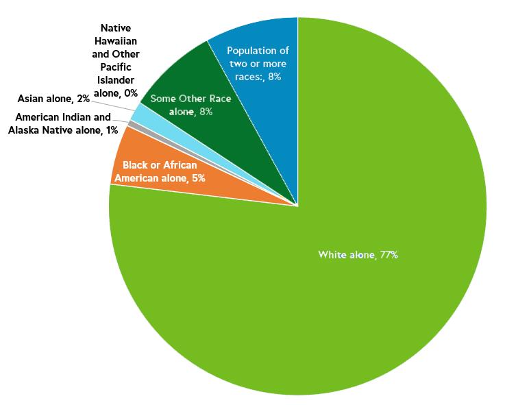 According to 2021 American Community Survey data, 77% of Town of Woodstock identifies as “White alone,” while 5% identify as Black or African American. 8% of the population identifies as Biracial. Other racial groups, such as Asian, Pacific Islander, American Indian, or Other Race Alone make up 3% of the Town.