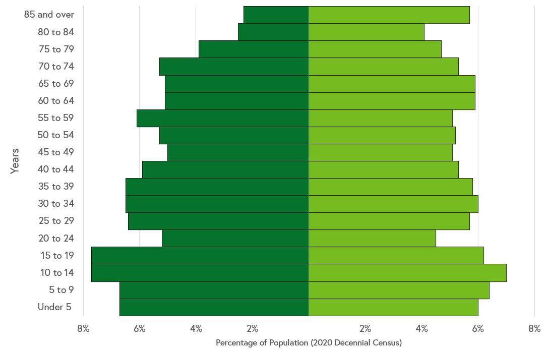 The United States Census Bureau has two major methods for collecting demographic information. The decennial census, required by the Constitution and conducted every ten years since 1790, is a short survey of every household in the country. The American Community Survey (ACS) is a longer form containing more questions, taken every year. It is published annually, and seeks to maintain accurate estimates by comparing the 1 year results with sets of 5 years. The decennial census has a smaller number of data points, like population, sex and race, with a lower margin of error. The ACS has a much larger number of data points (like social, economic and housing characteristics) and a wider margin of error. A mix of decennial census and ACS data is used to form the empirical basis for the Comprehensive Plan, to report a picture of the community as accurately as possible. This plan uses a combination of Decennial Census data and 2021 ACS 5 Year Estimates, which is the most recently available data as of the creation of this document.