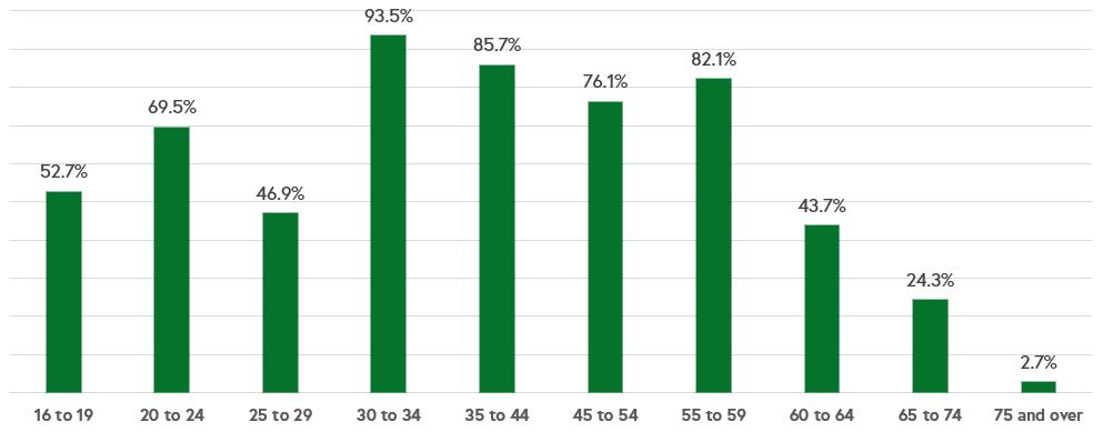 The median age in the Town of Woodstock is estimated at 39.1. For comparison, the median age in Virginia is 38.8. The age pyramid above shows Woodstock’s population grouped by sex and age category. Woodstock’s population appears to be getting younger. For example, the median age for the 2010 American Community Survey estimates was 46 years old. The population pyramid above is made using 2020 Decennial Census information because it is considered more accurate than the American Community Survey, although this information is not the latest available. In many communities, the pyramid looks “inverse,” with a larger aging population over top of a thinning younger population. This can create a difficult situation in continuing to support a robust economy while providing the services that the aging population also relies on. In Woodstock, this is fortunately not the case with the Town’s population growing and getting younger there is a strong foundation for continued vitality in the community. However, the Town could improve even further by ensuring that its younger generation is especially attracted to and able to make Woodstock their home in the future. The lower percentage of the population between 20 and 34 shows where potential residents are moving away for college or other opportunities.