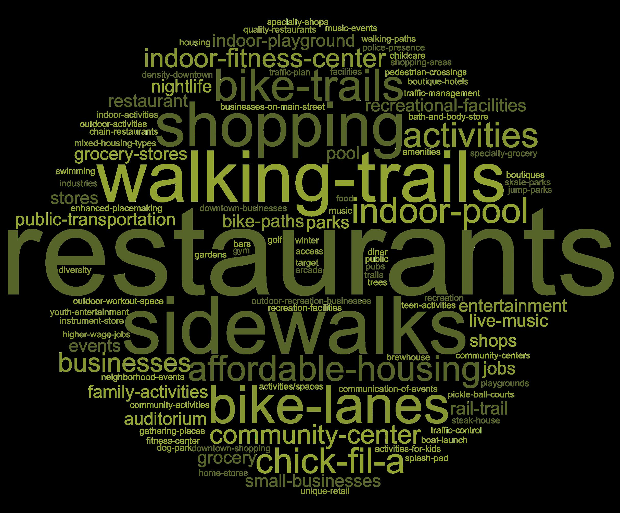 However, there’s always room for improvement. Most respondents want to safely walk or ride bikes and be active in their town through improved sidewalks and bike routes. Many responses want more restaurants, shopping, and events or activities downtown to allow them to spend their money locally and support local entrepreneurs. Respondents love their public spaces and they’d love to see more improvements such as an indoor pool, more fitness options, and outdoor events for teens and kids.