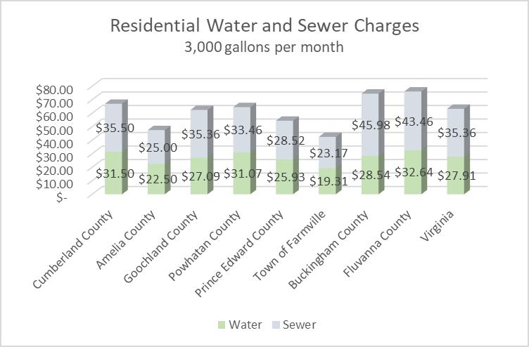 Residential customers in Cumberland County pay $31.50 per month for 3,000 gallons of water ($29.00 for 3,000 gallons plus $2.50 service charge). This rate is comparable and favorable when compared to similarly sized water systems in Virgina. Additionally, when compared to surrounding counties, Cumberland County's residential rate is similar to rates in Powhatan and Fluvanna Counties, but rates in the other nearby counties are slightly lower. (See slides 8 and 9)