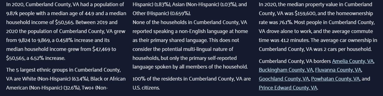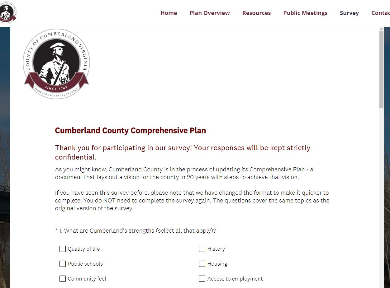 Cumberland’s long north to south orientation lends itself to some challenges. It was often mentioned that those living in the northern part of the County will go to Goochland County to shop or participate in events. Those in the central Cumberland area of the County, will often go east to Powhatan to do their shopping. Those in the Randolph area think of themselves as members of the Town of Farmville community. While identifying with multiple places is not a problem, it appears that Cumberland County’s self-identity needs reinforcement. Cumberland is not its neighbors and may have similar or completely different challenges unique to its residents. The historic name “Cumberland” may be utilized across the country, but there is only one Cumberland County, Virginia. It is a special place with beautiful landscapes and hardworking, compassionate people.