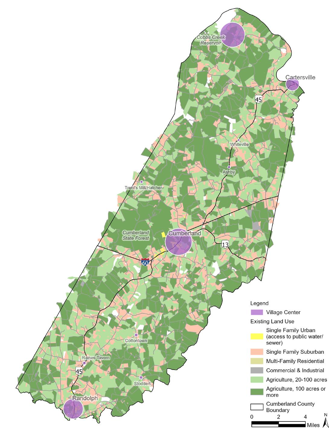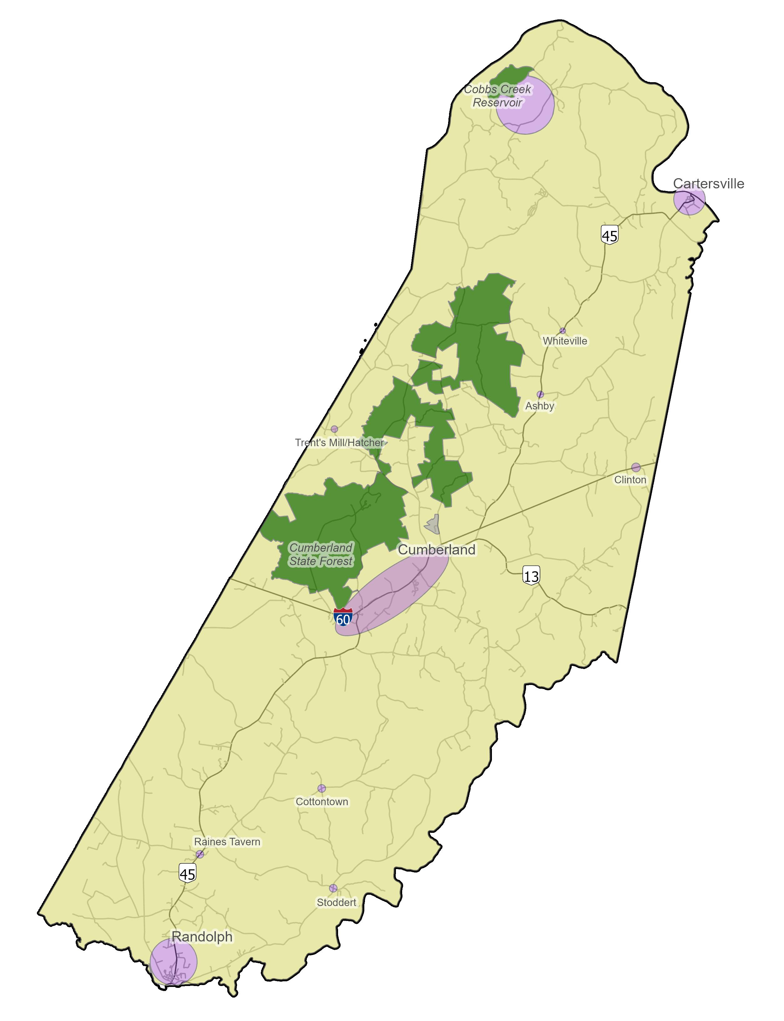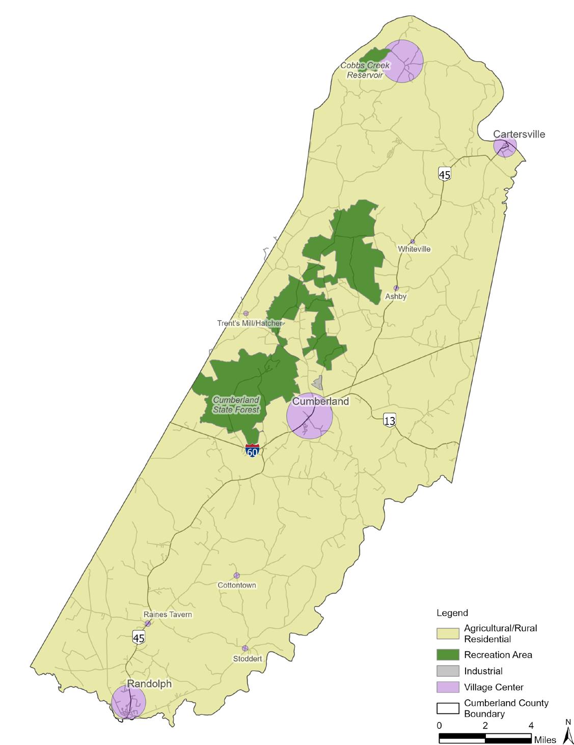 Directing growth to central village centers will help create local environments for Cumberland’s citizens to thrive in. Rather than allowing development to sprawl across the County and encroach on agricultural areas, high quality development can be maintained in specified village centers. These village centers include the Randolph area, north of Randolph, the Cartersville area in the north of the County, Cobbs Creek Reservoir area also in the north of the County, identified “Rural Crossroads” throughout the County, and Cumberland’s namesake and central court house area.