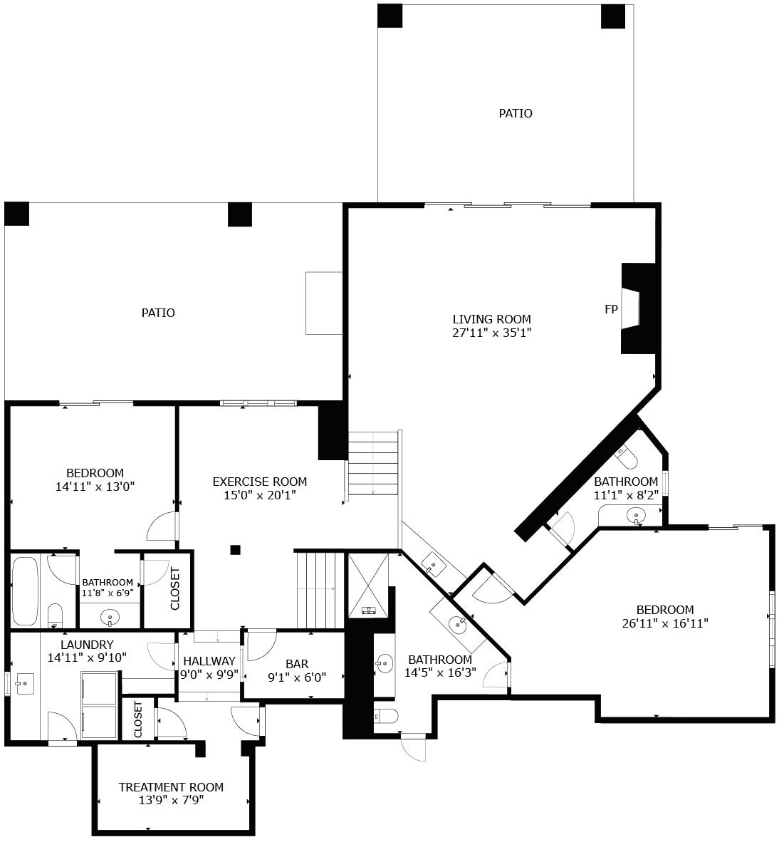 - Family Room: Large rec room, wet bar with beverage refrigerator, and wood-burning gas starter fireplace with stone mantel