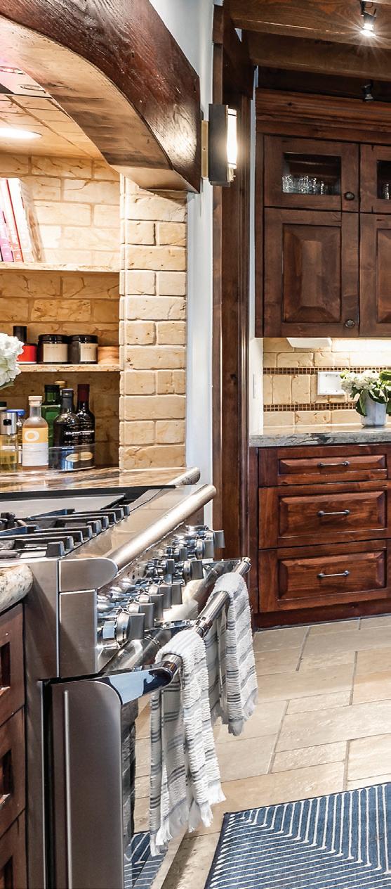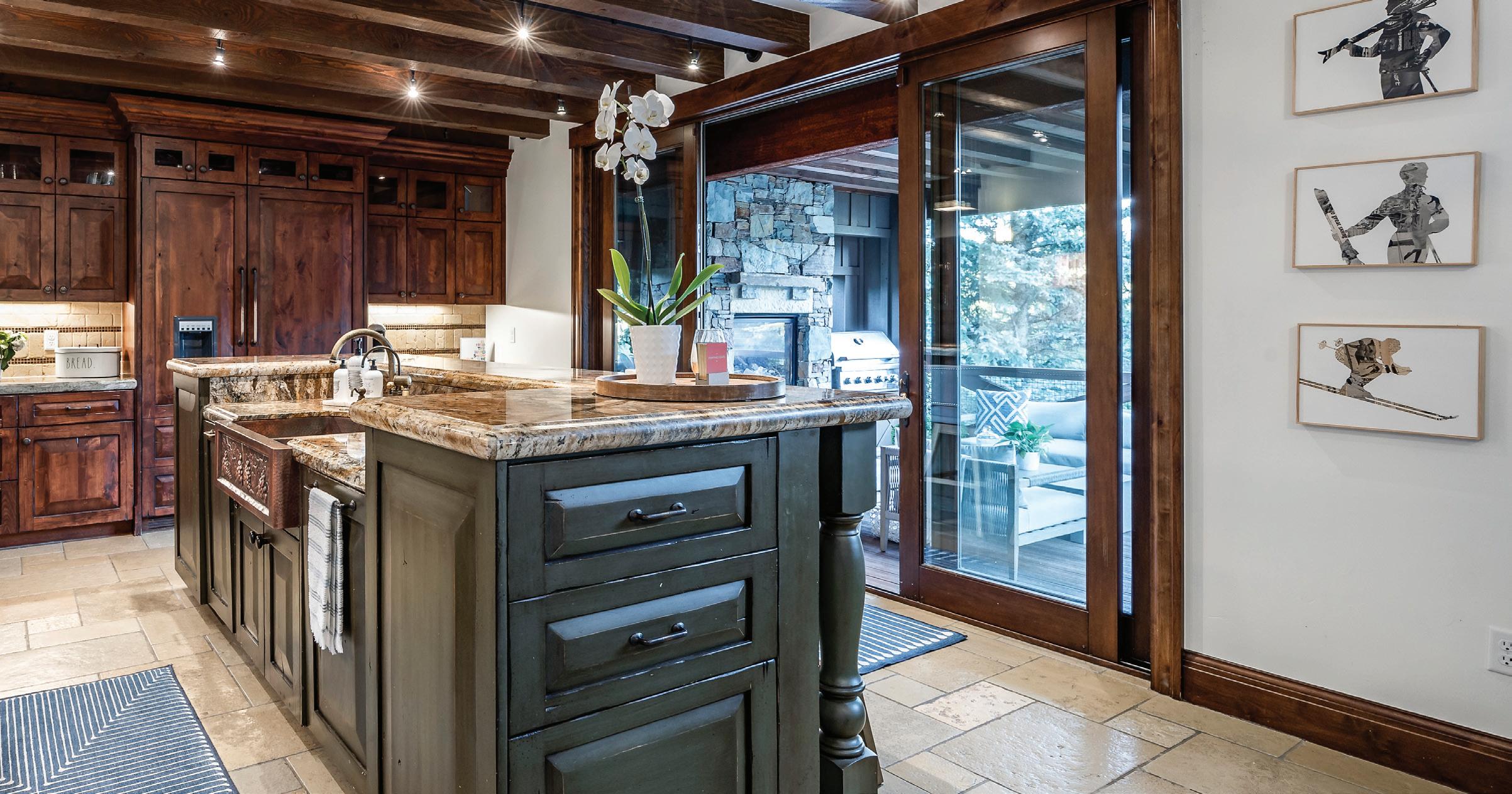 - Kitchen: Thermador double ovens and range, Thermador refrigerator and freezer, Bosch dishwasher, pebble ice maker, wood beam accents, seating at the island plus a breakfast table, butler’s pantry, and direct access to the deck