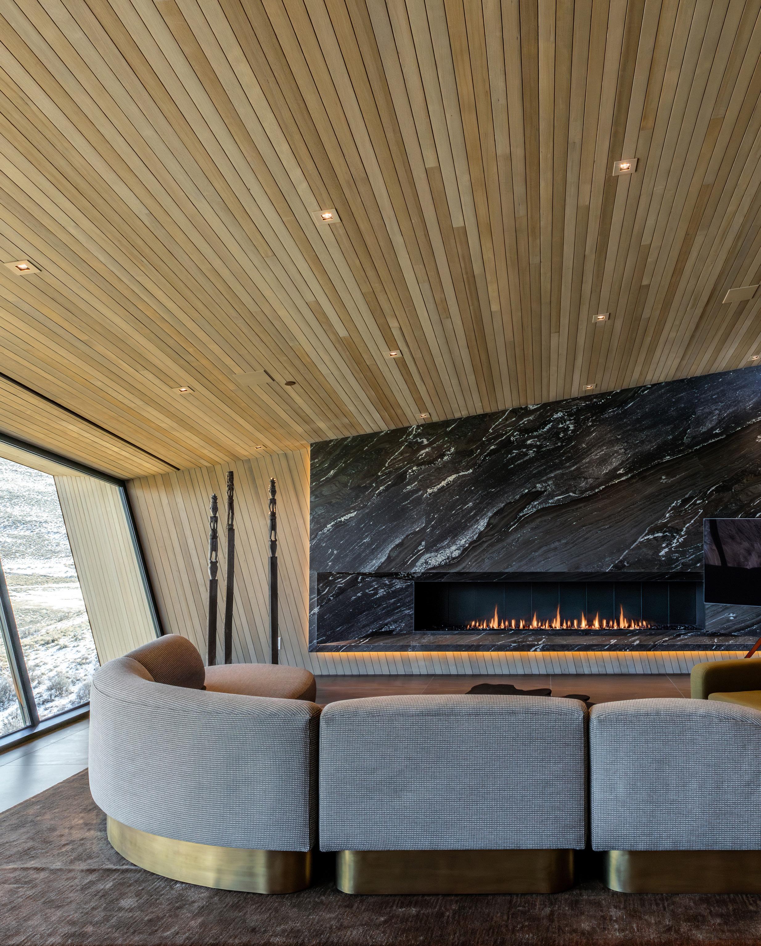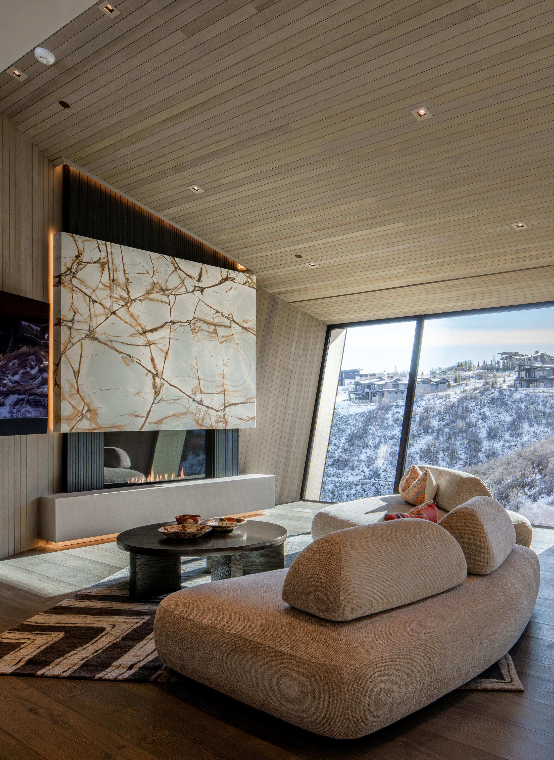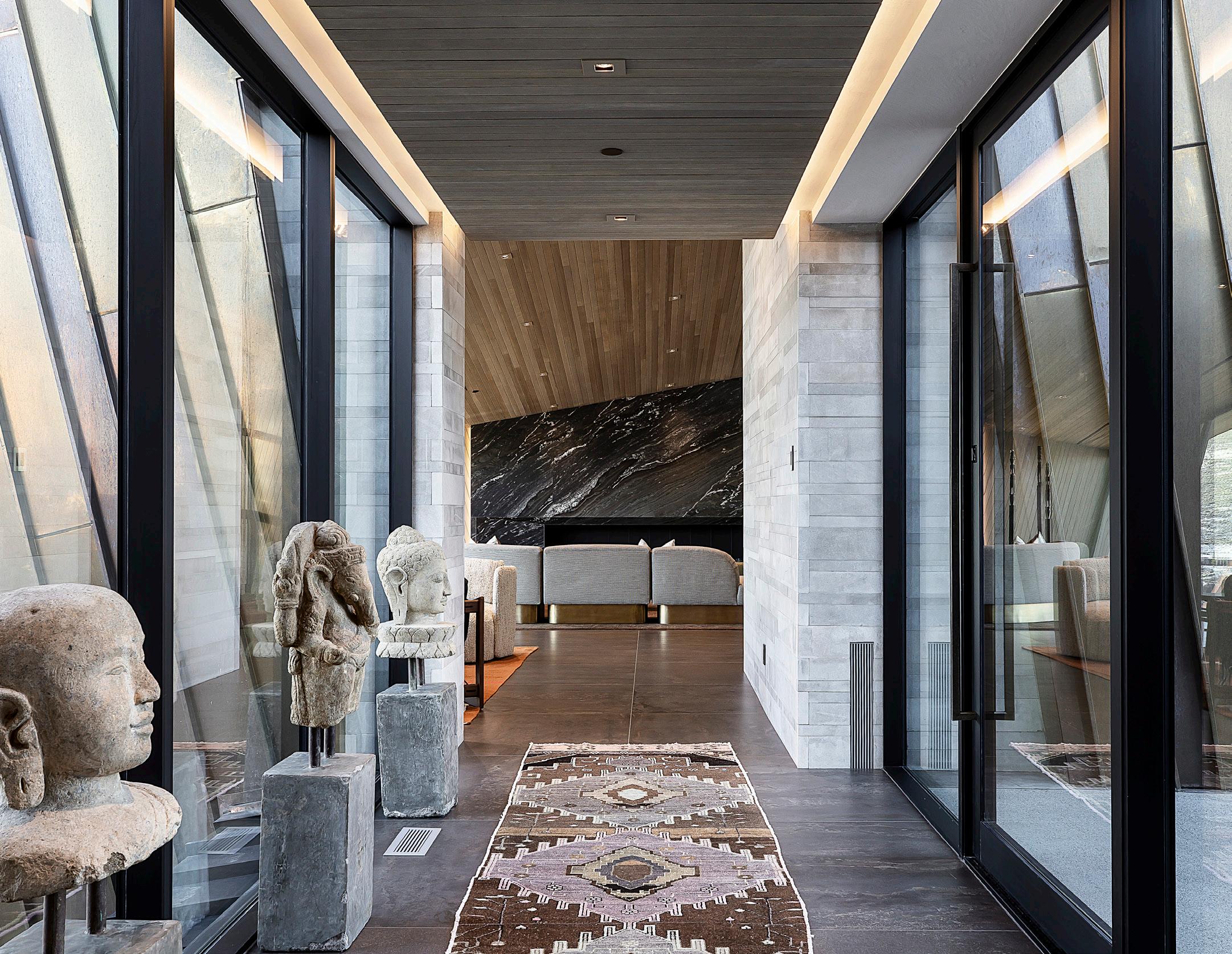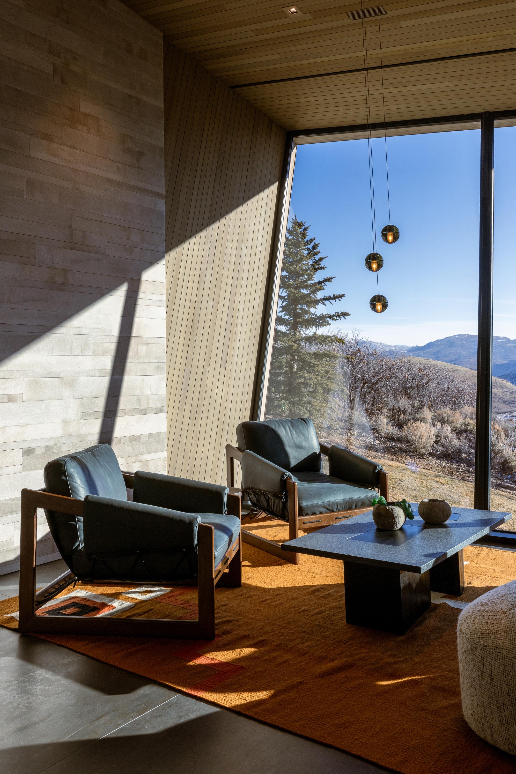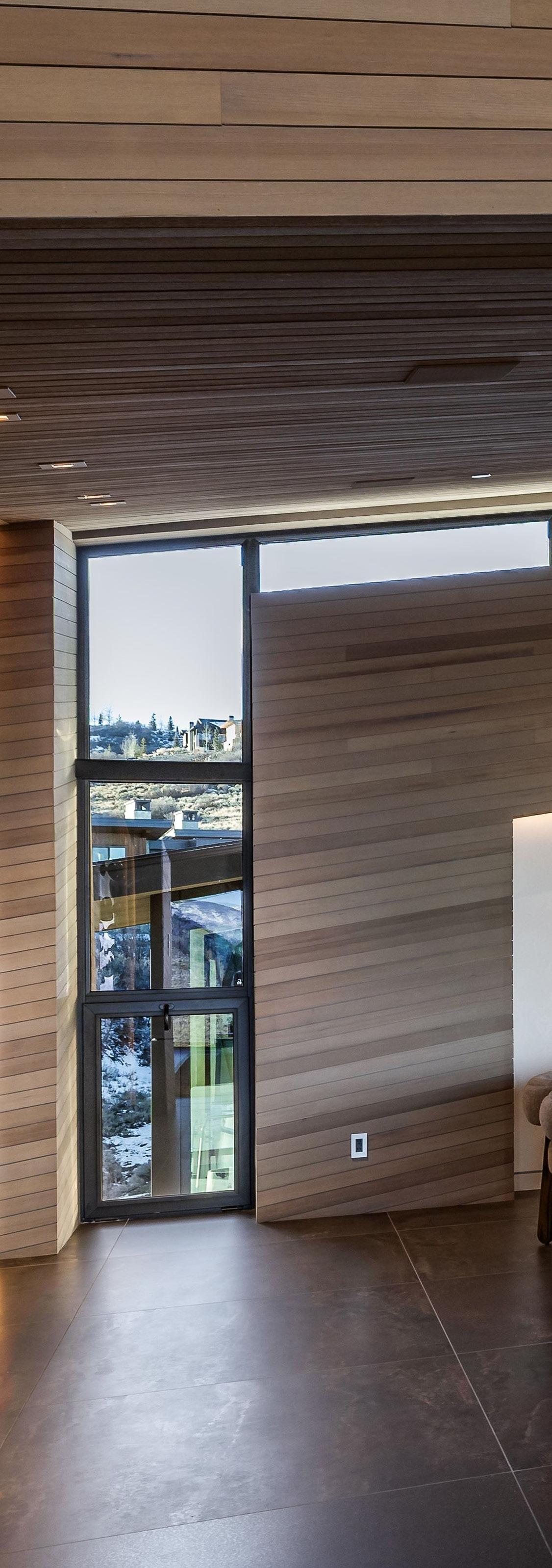 A glass-railed bridge delivers a dramatic arrival, guiding guests into approximately 8,200 square feet of living space. Inside, ceiling heights rise and fall in deliberate progression— intimate, grounded moments unfolding into expansive vaulted volumes, culminating in a monumental wall of leaning glass that frames the Uinta range in cinematic scale.