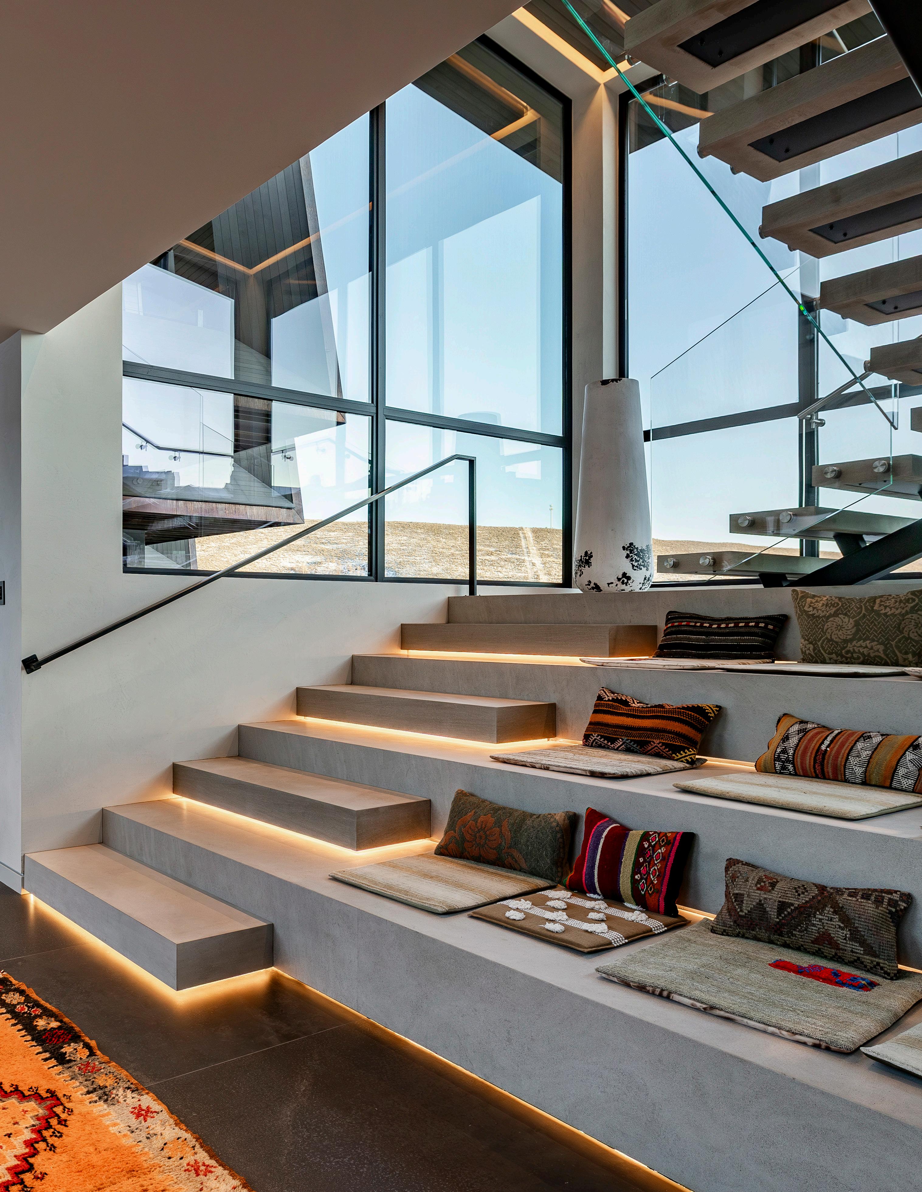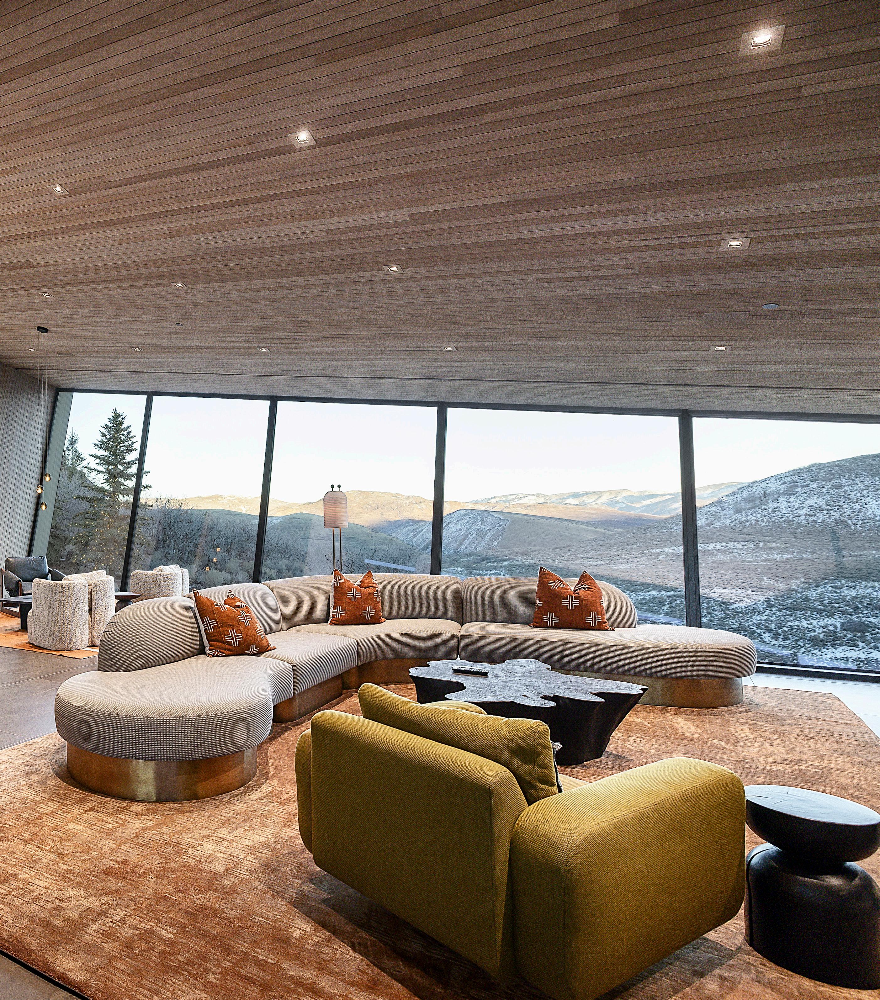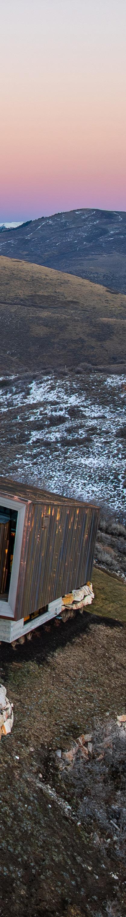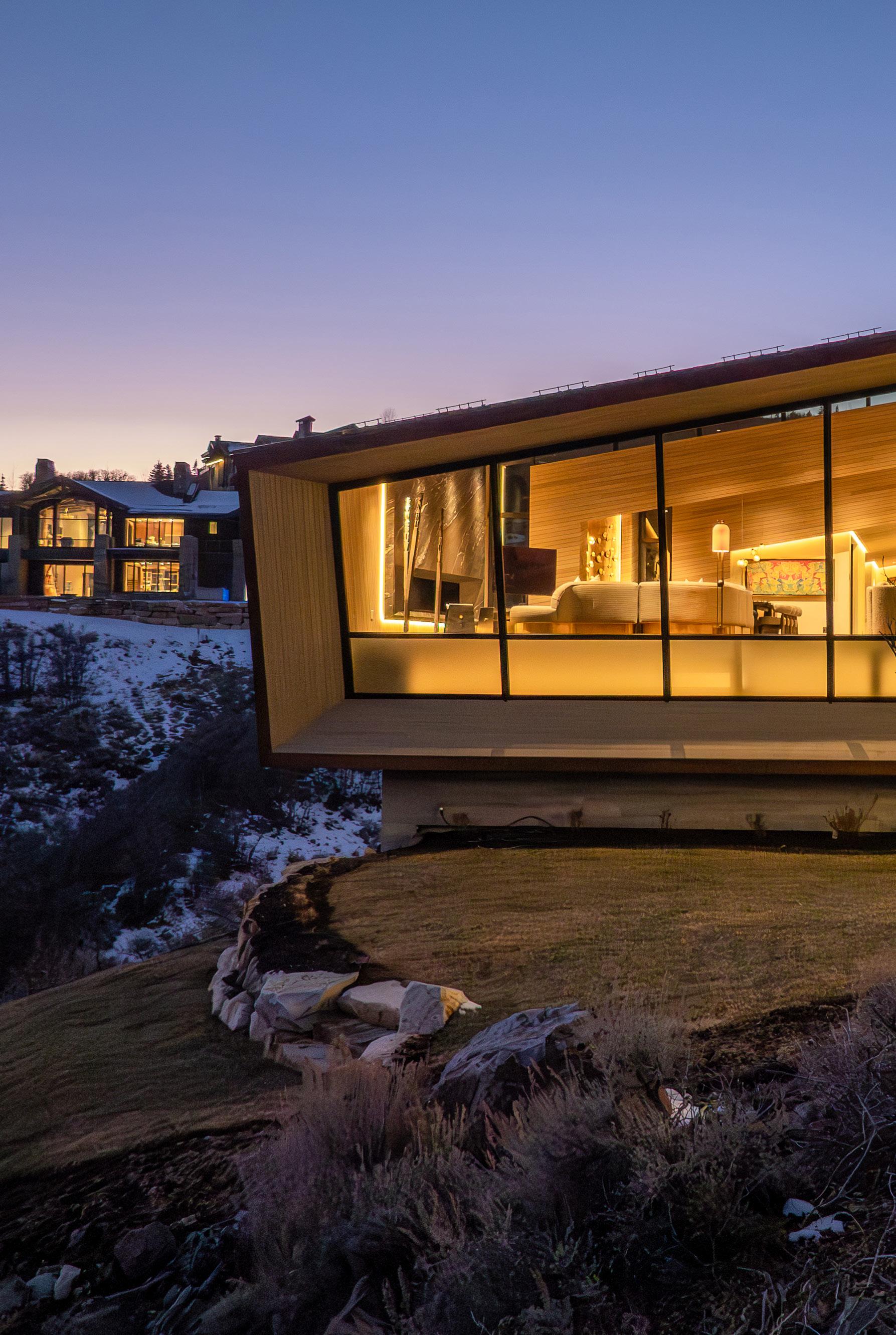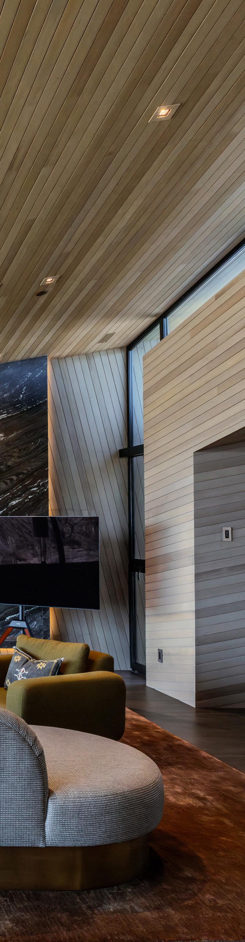 A glass-railed bridge delivers a dramatic arrival, guiding guests into approximately 8,200 square feet of living space. Inside, ceiling heights rise and fall in deliberate progression— intimate, grounded moments unfolding into expansive vaulted volumes, culminating in a monumental wall of leaning glass that frames the Uinta range in cinematic scale.