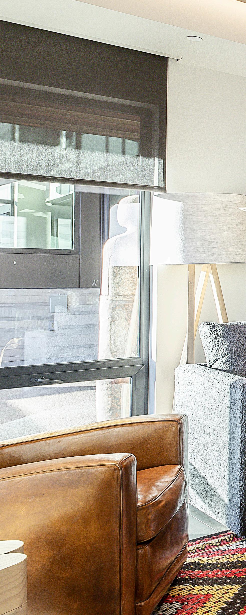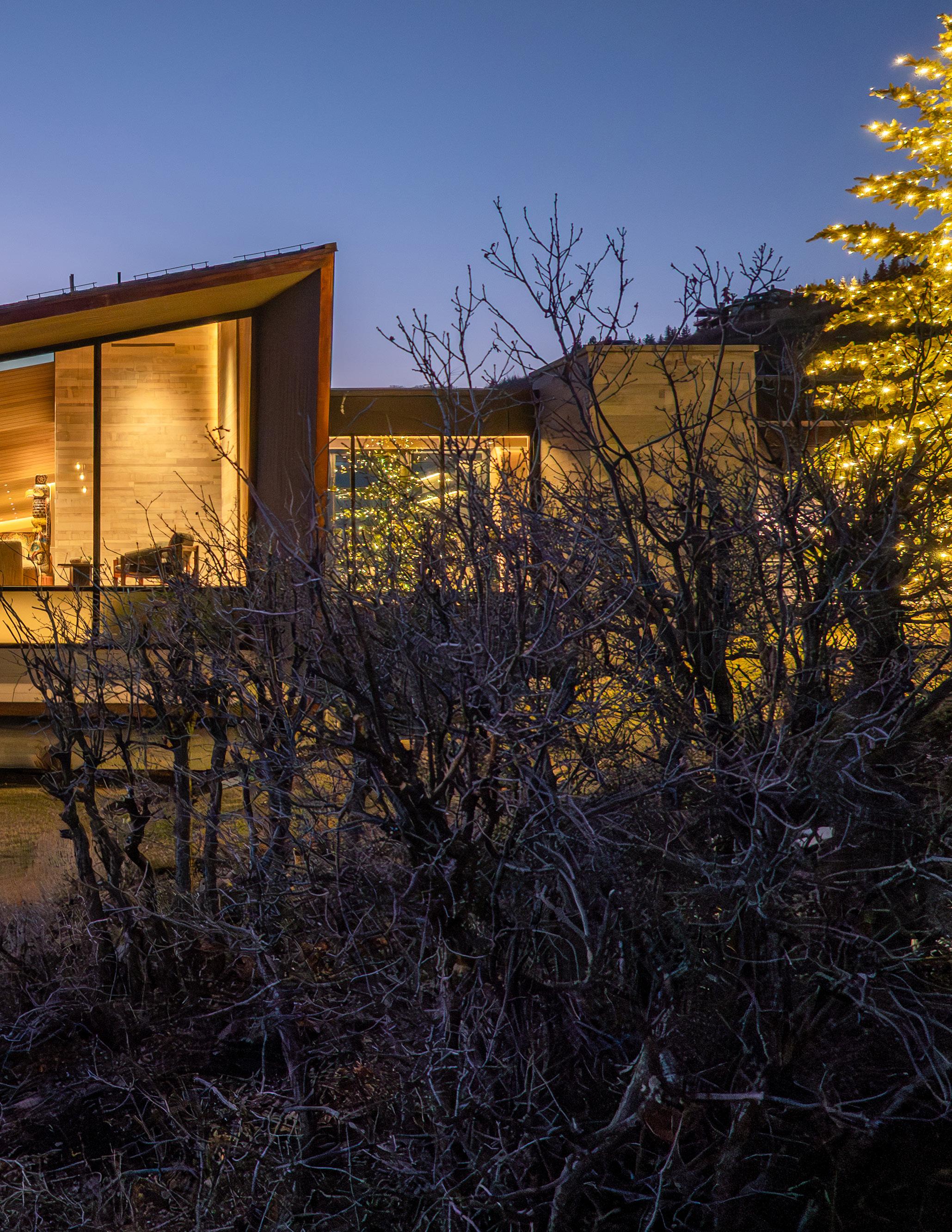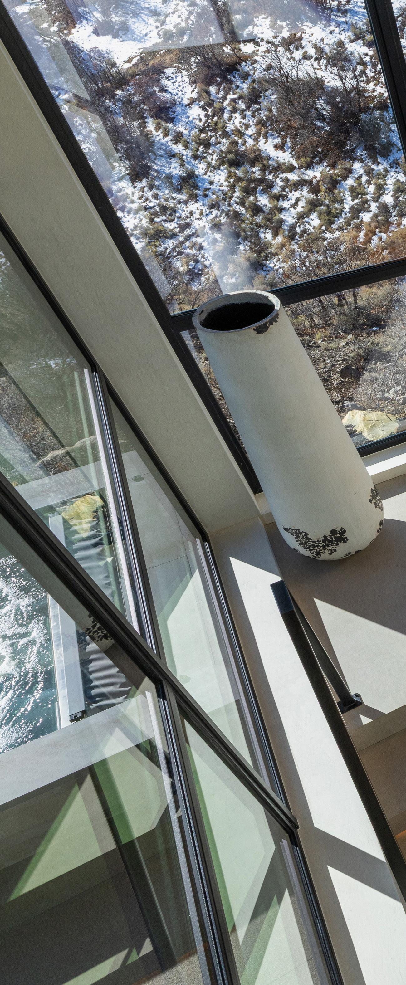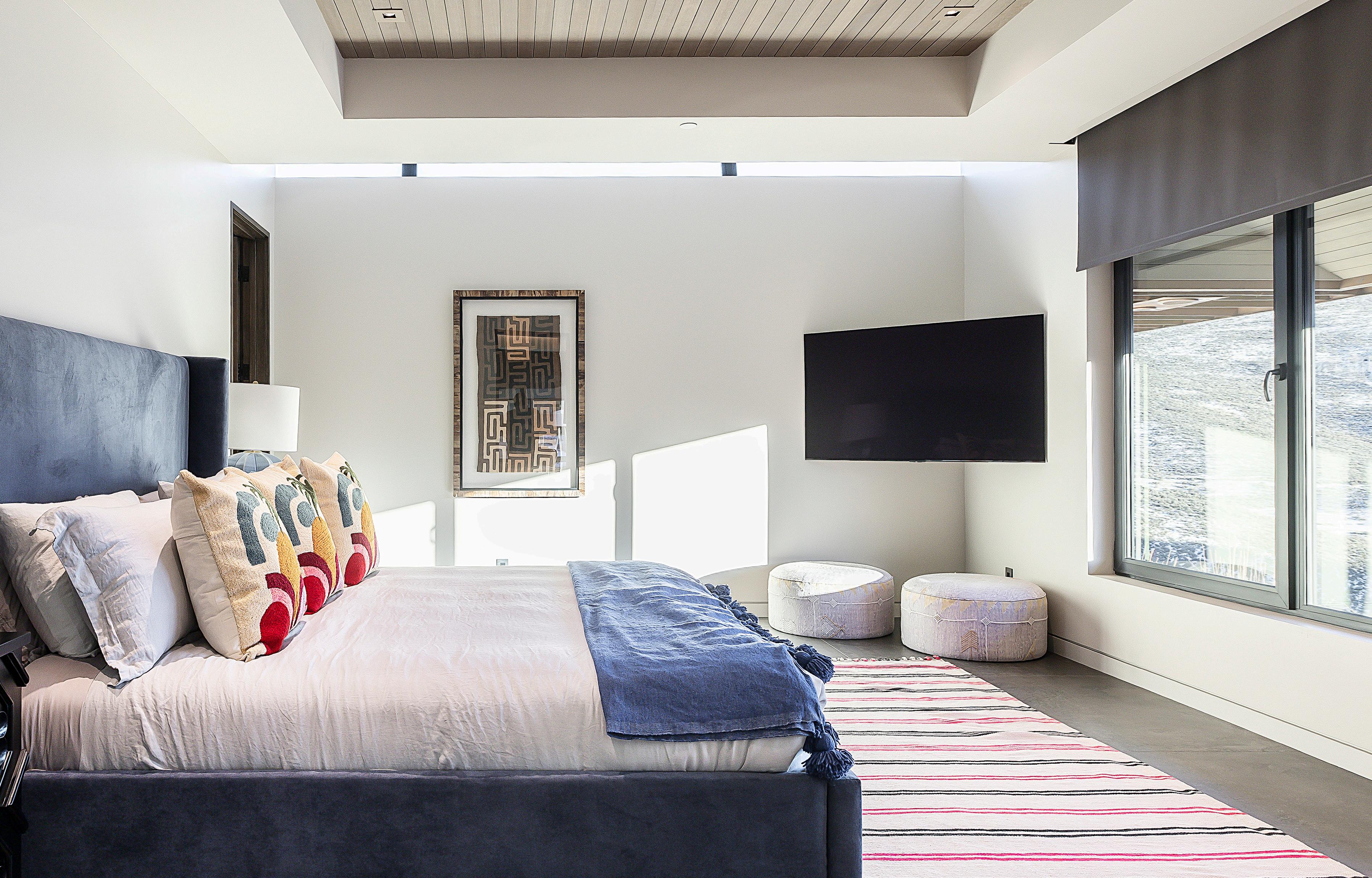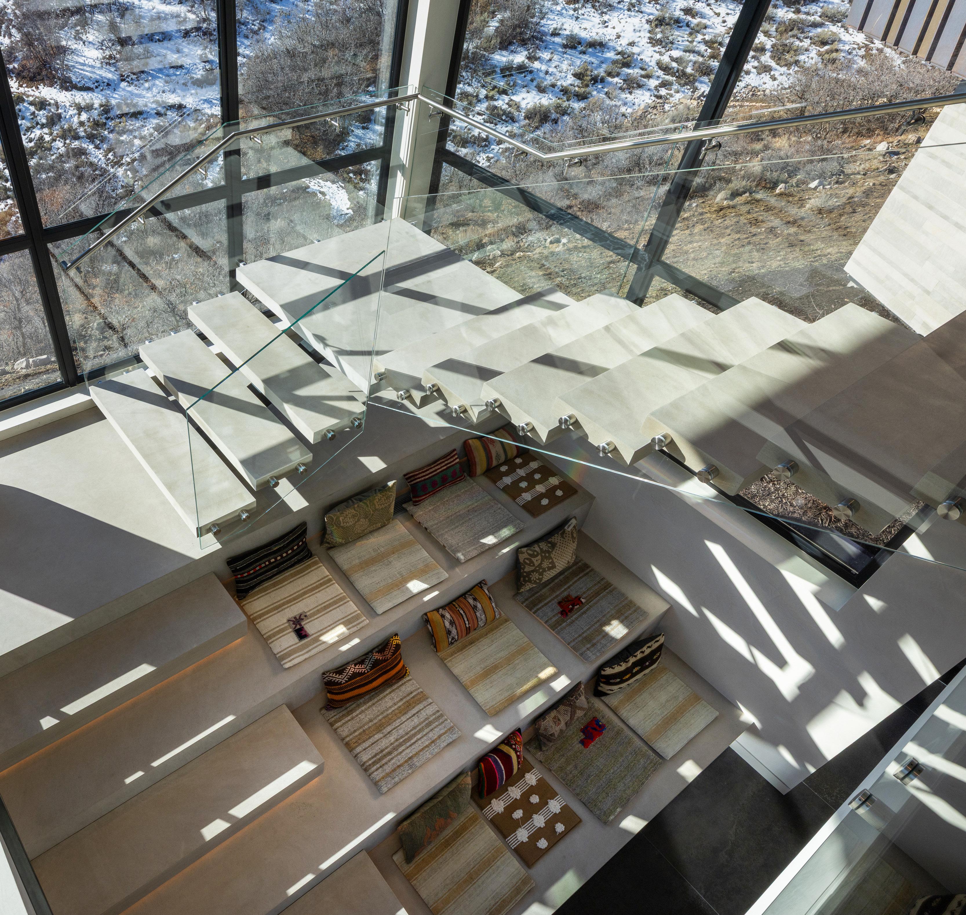 A glass-railed bridge delivers a dramatic arrival, guiding guests into approximately 8,200 square feet of living space. Inside, ceiling heights rise and fall in deliberate progression— intimate, grounded moments unfolding into expansive vaulted volumes, culminating in a monumental wall of leaning glass that frames the Uinta range in cinematic scale.