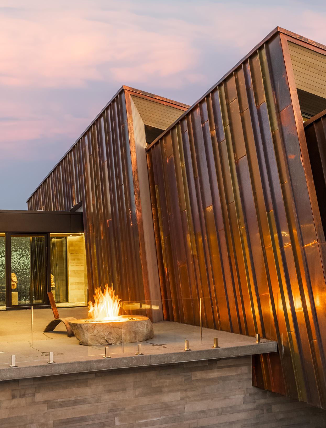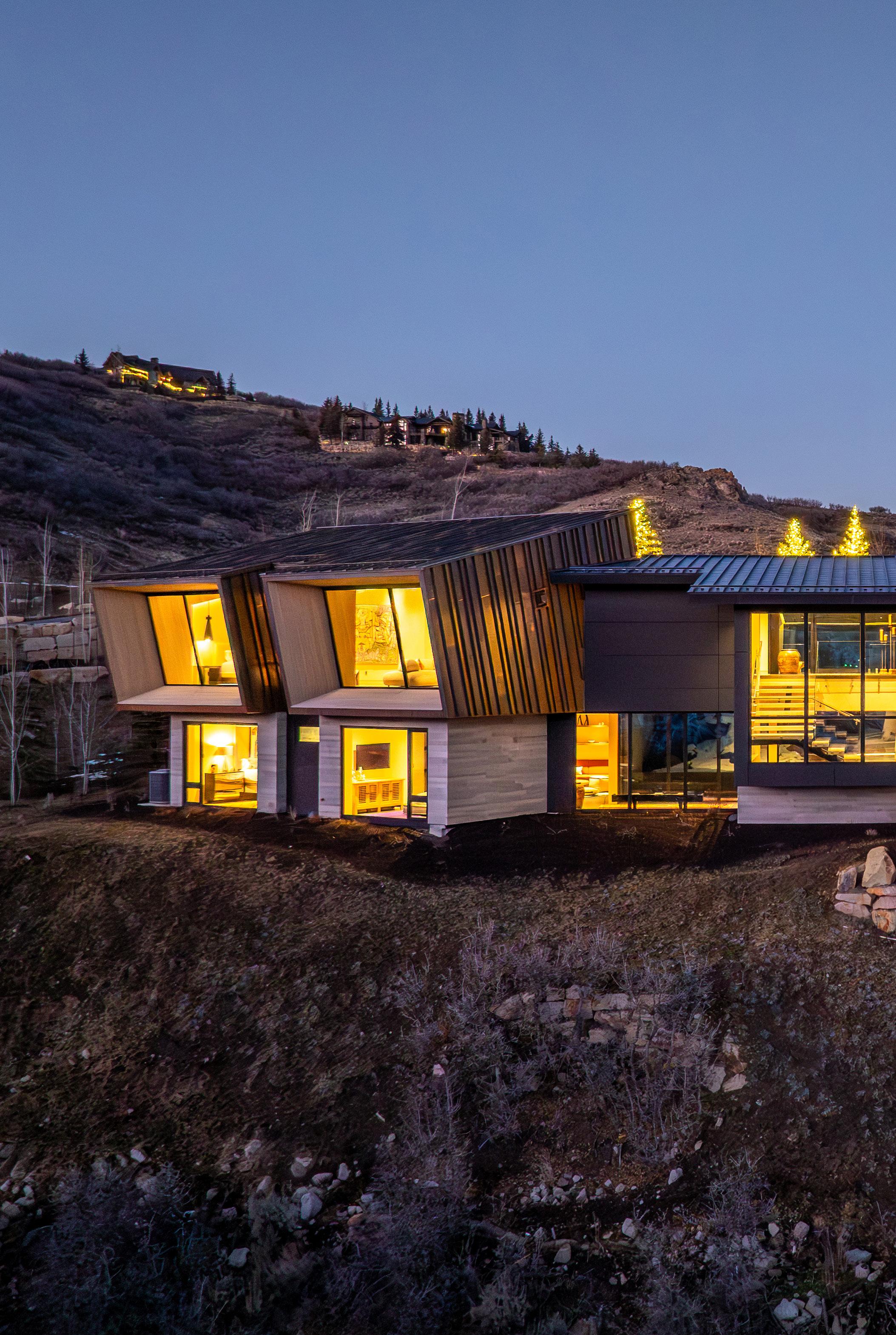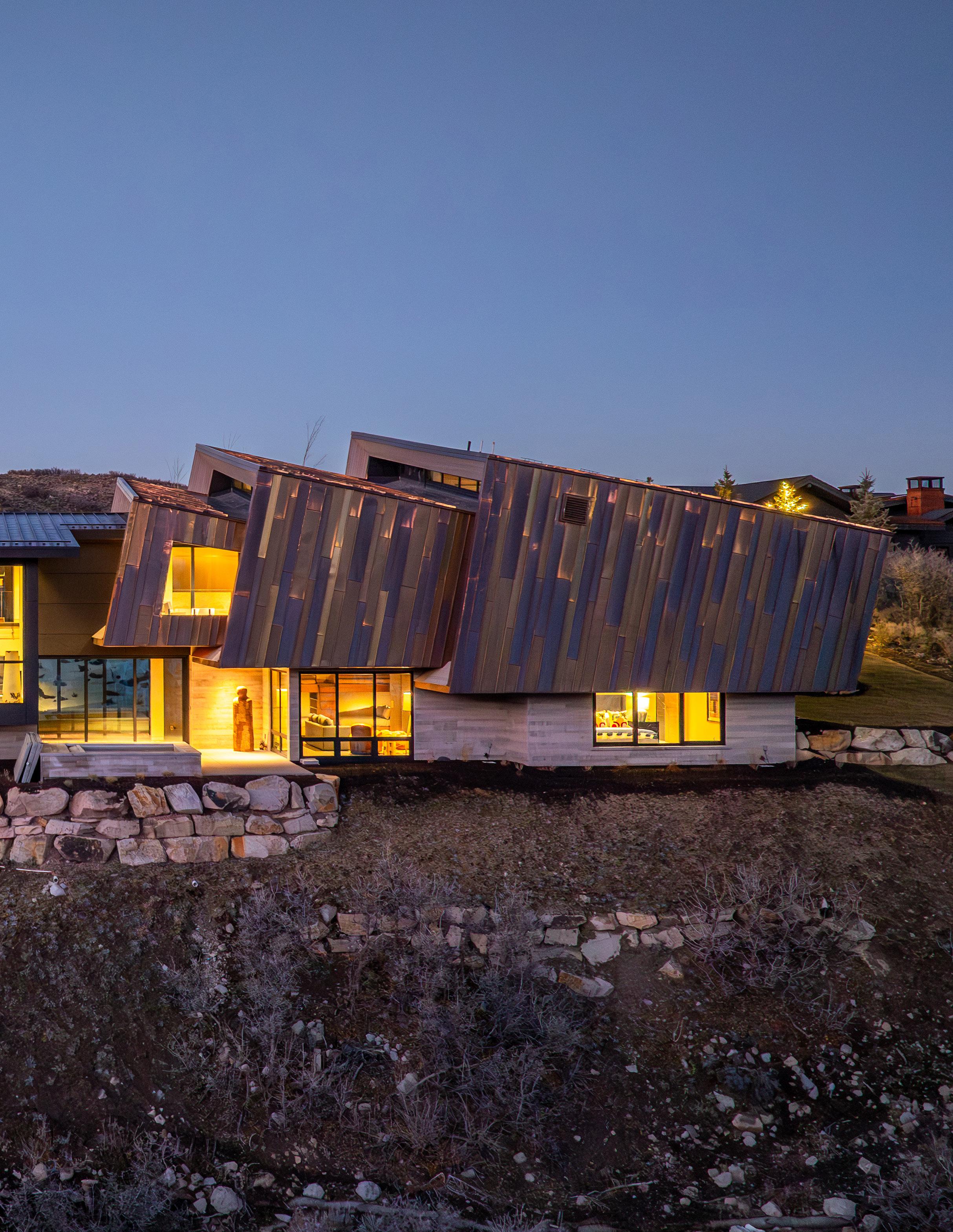 Designed by Salt Lake City–based Upwall Design in conjunction with Studio Pace and built by McGinnis Homes, Copperfold immediately distinguishes itself through a bold composition of copper, bronze, and brass-clad trapezoidal forms. These geometric masses nest into one another in a rhythmic sequence, a subtle “Russian doll” effect, while sloped rooflines mirror the natural grade of the land.