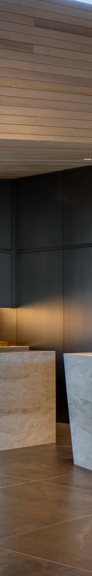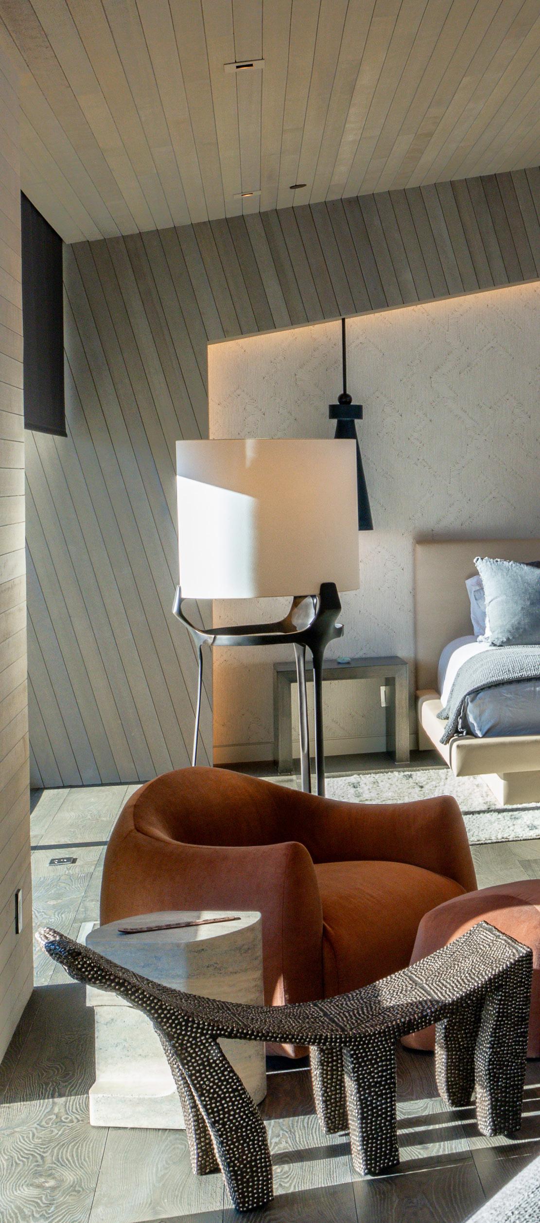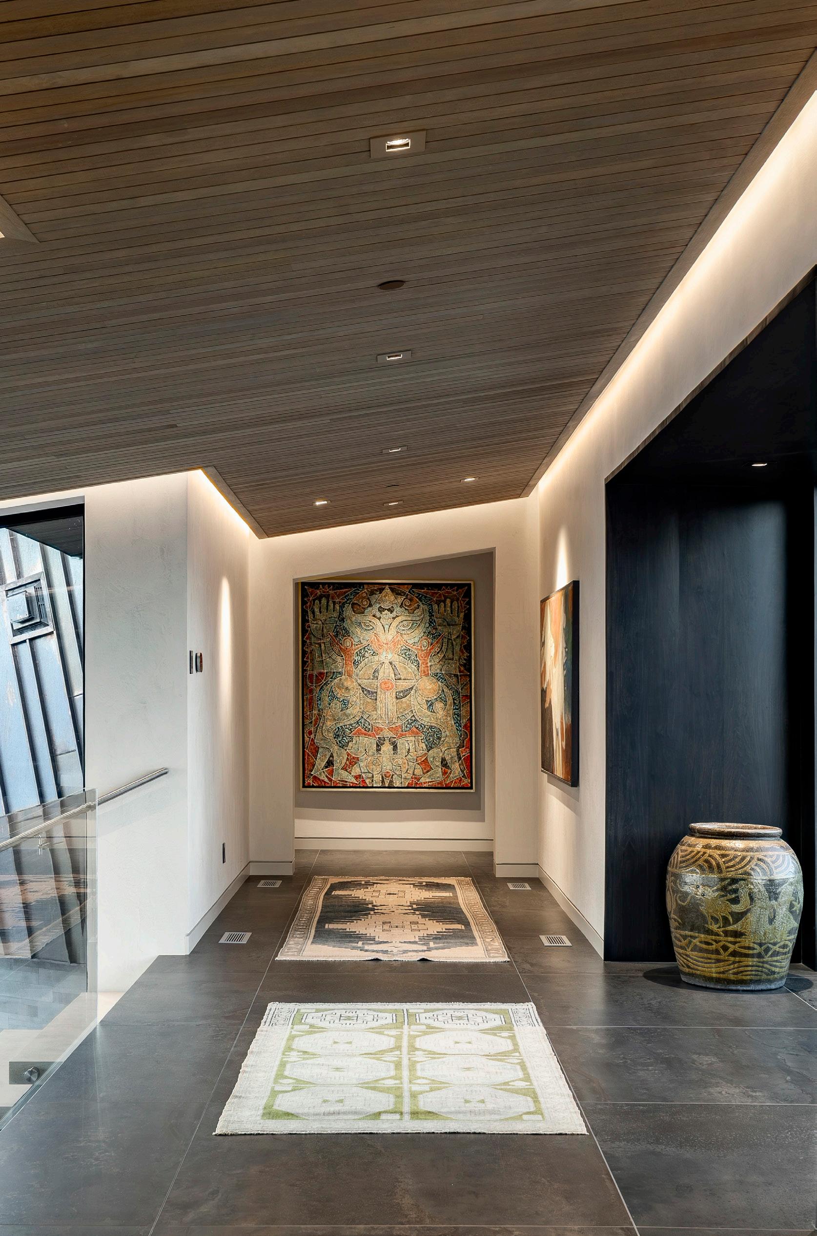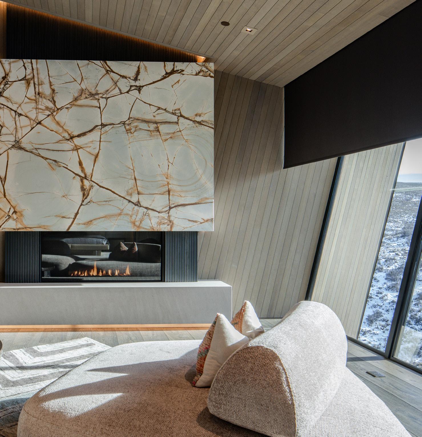 Quartzites including Fusion Blue and Taj Mahal wrap counters, islands, and hearths in dynamic movement and remarkable durability. Venetian plaster walls meet backlit cedar ceilings in layered light and shadow.