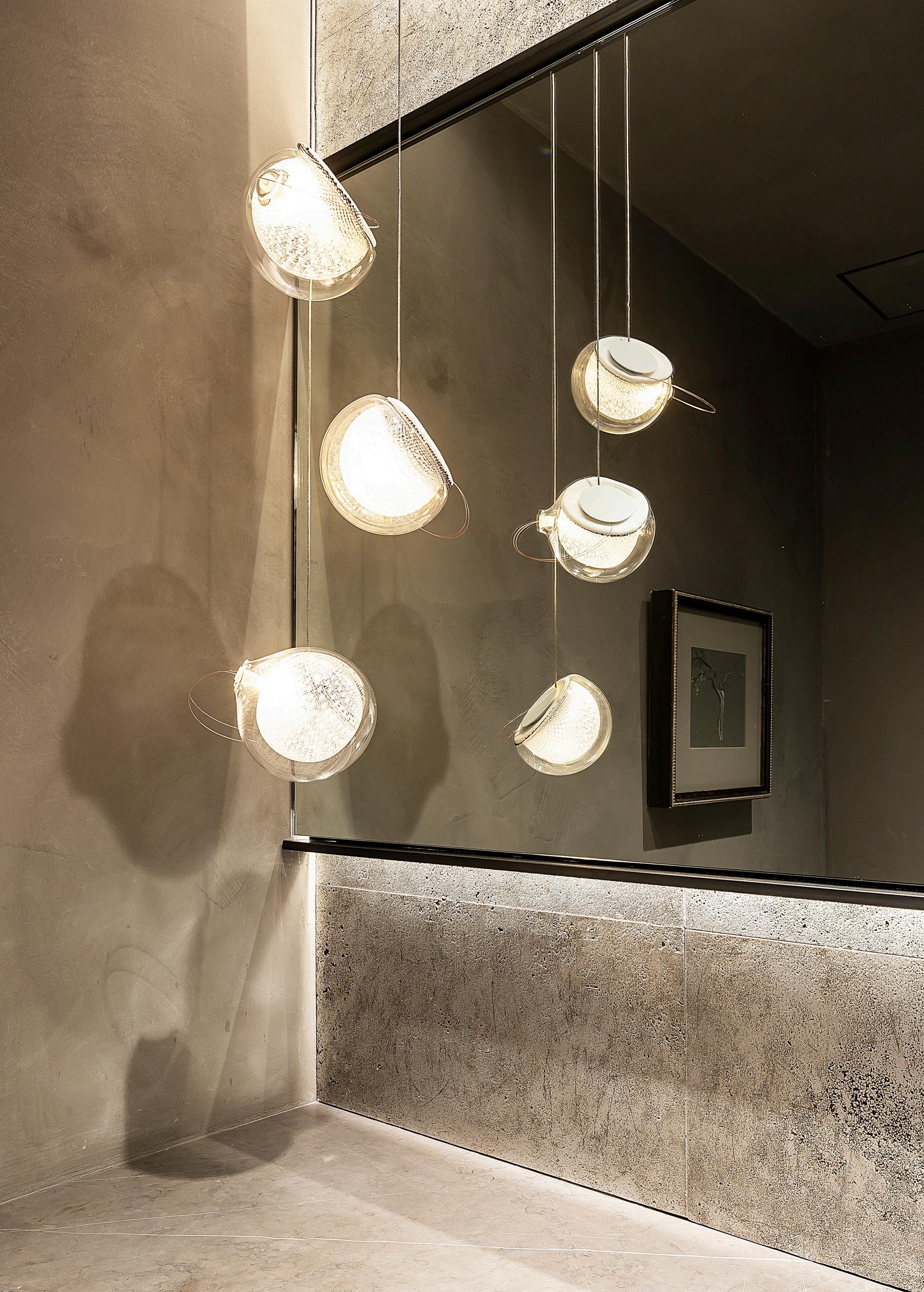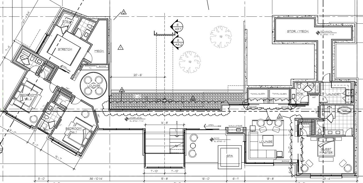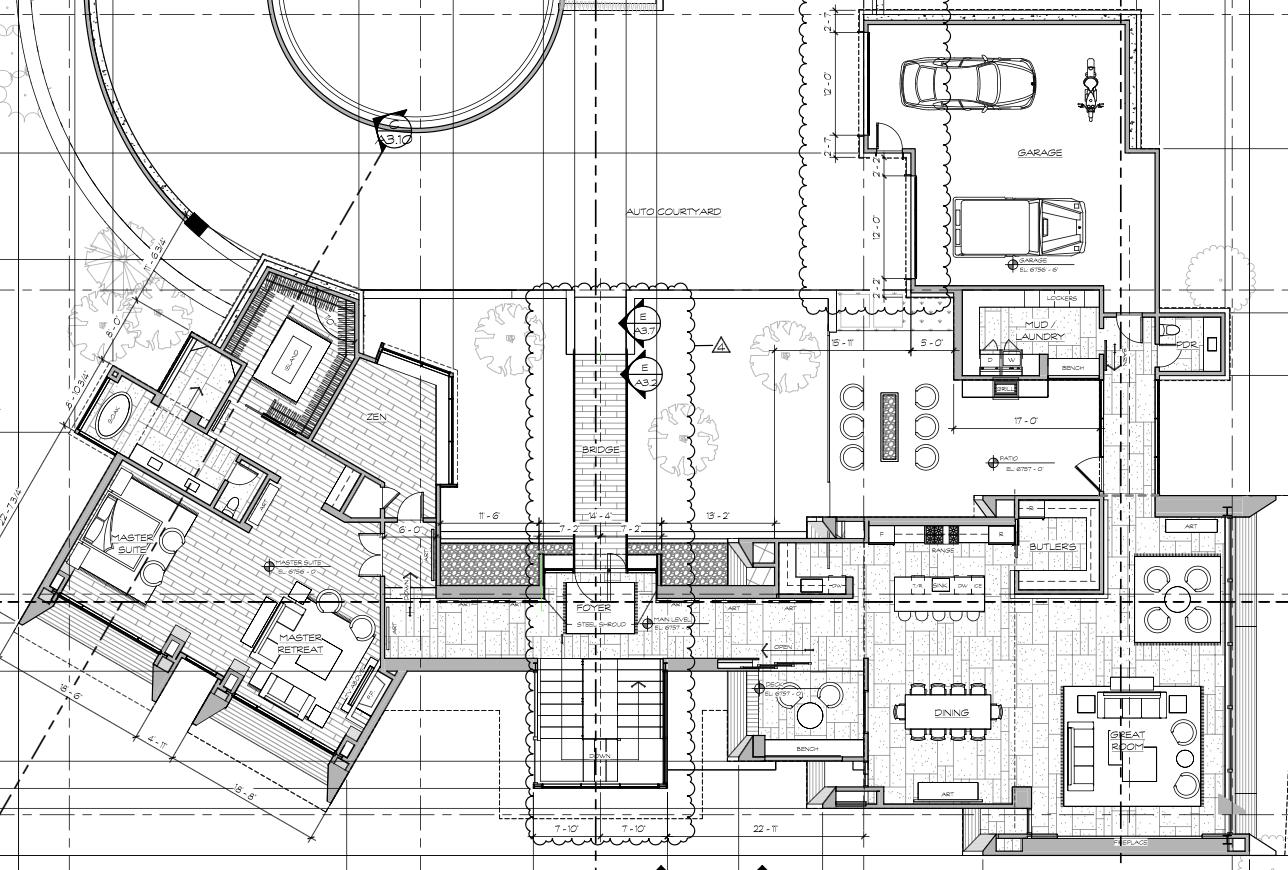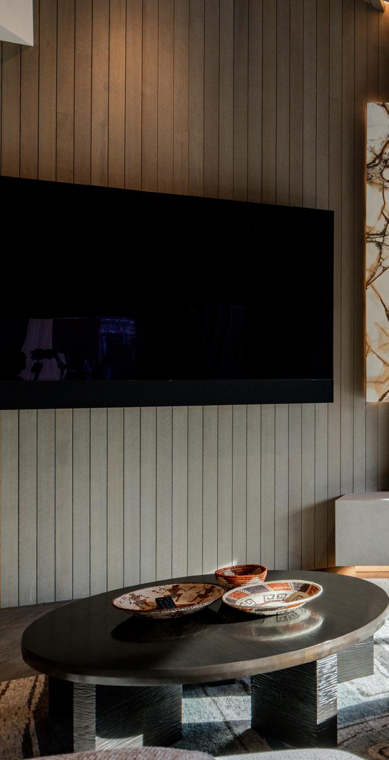 Quartzites including Fusion Blue and Taj Mahal wrap counters, islands, and hearths in dynamic movement and remarkable durability. Venetian plaster walls meet backlit cedar ceilings in layered light and shadow.
