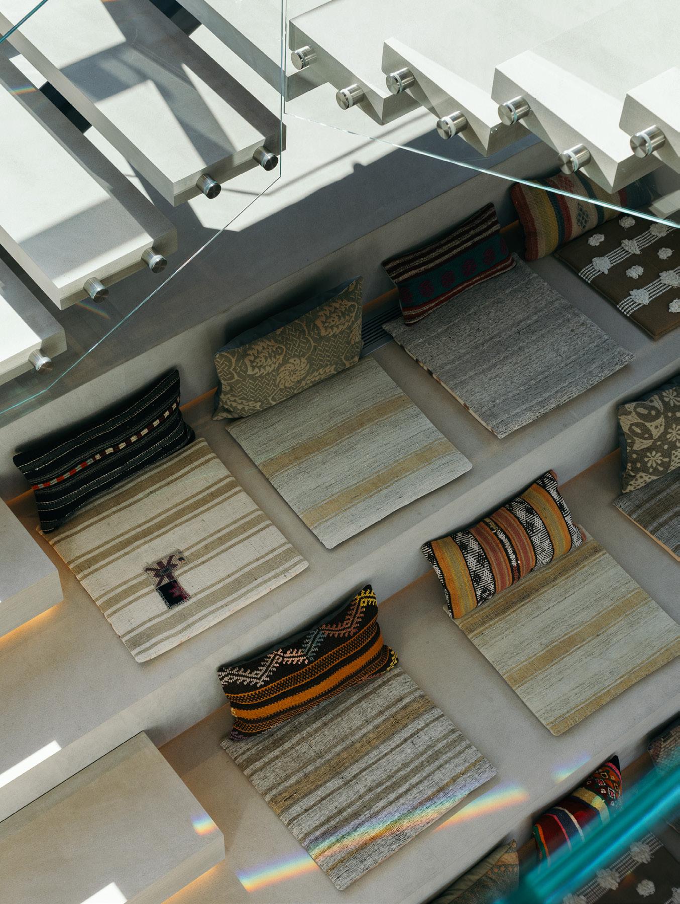 A corridor designed as a sculpture gallery leads to a floating staircase with a dedicated seating area—an architectural pause before entering the private quarters.