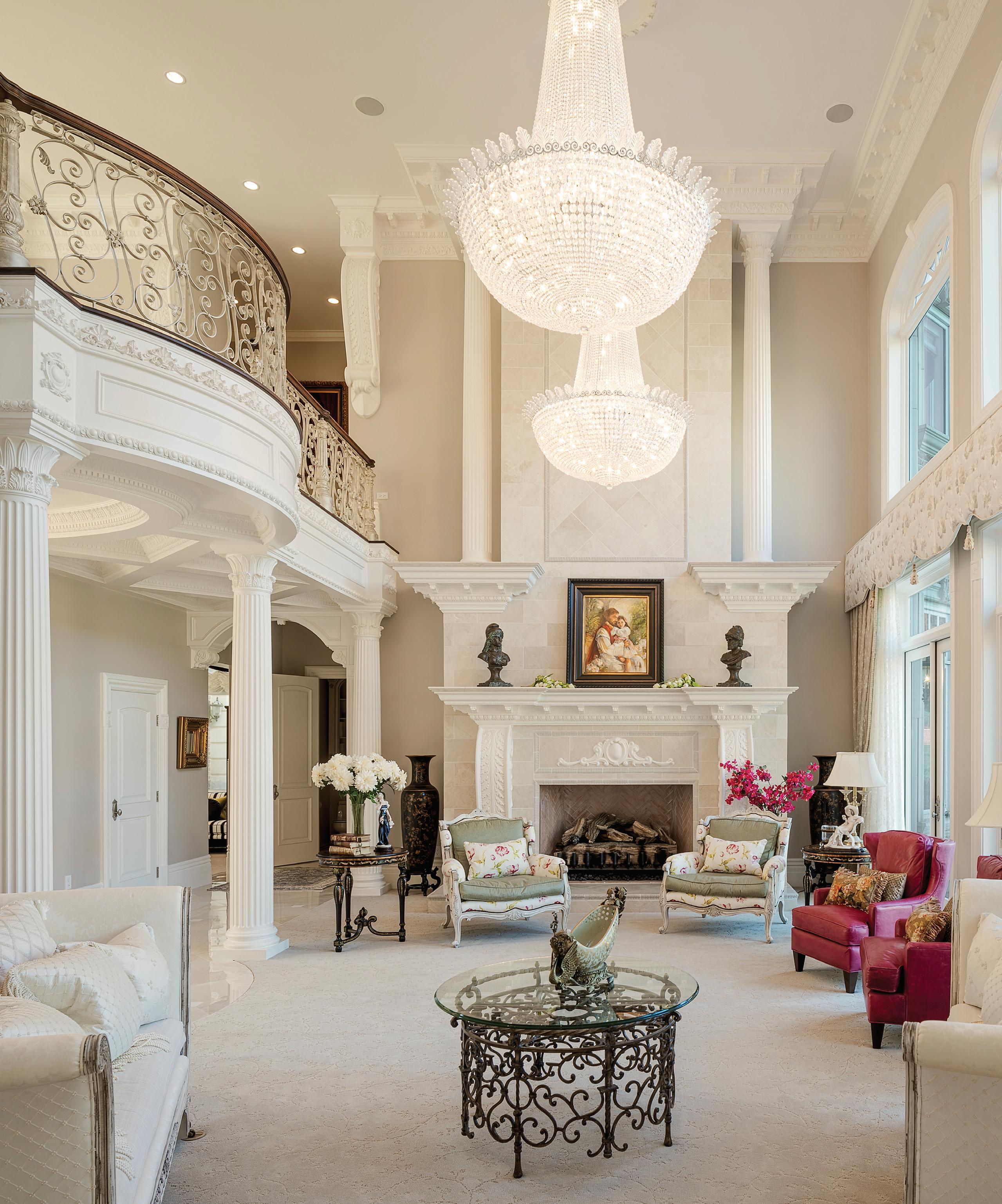 The living room is a wonderful example of the French influences in the design of the home: soft light colors, luxurious furnishings, a two-story fireplace with a finely-crafted mantle and moldings, two stunning chandeliers along with large windows and French doors that open to a deck and provide commanding views of the grounds and mountains in the distance.