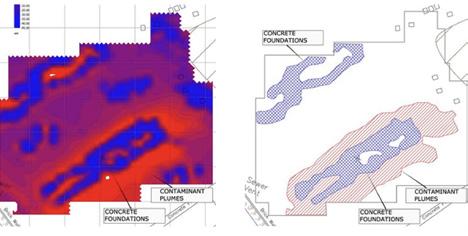 Above: Geophysics data indicating the subsurface siting of concrete foundations and also areas of contaminants.
