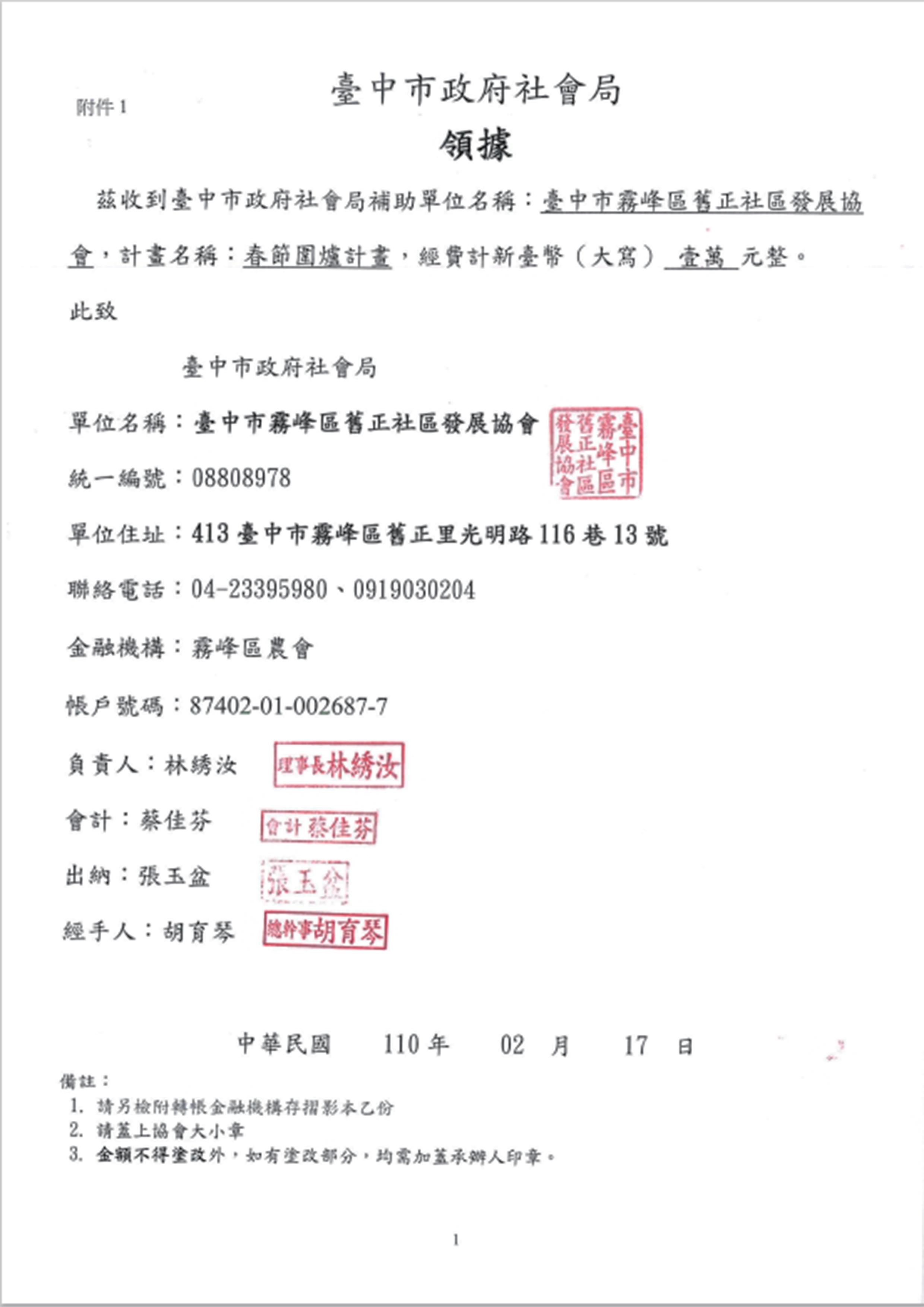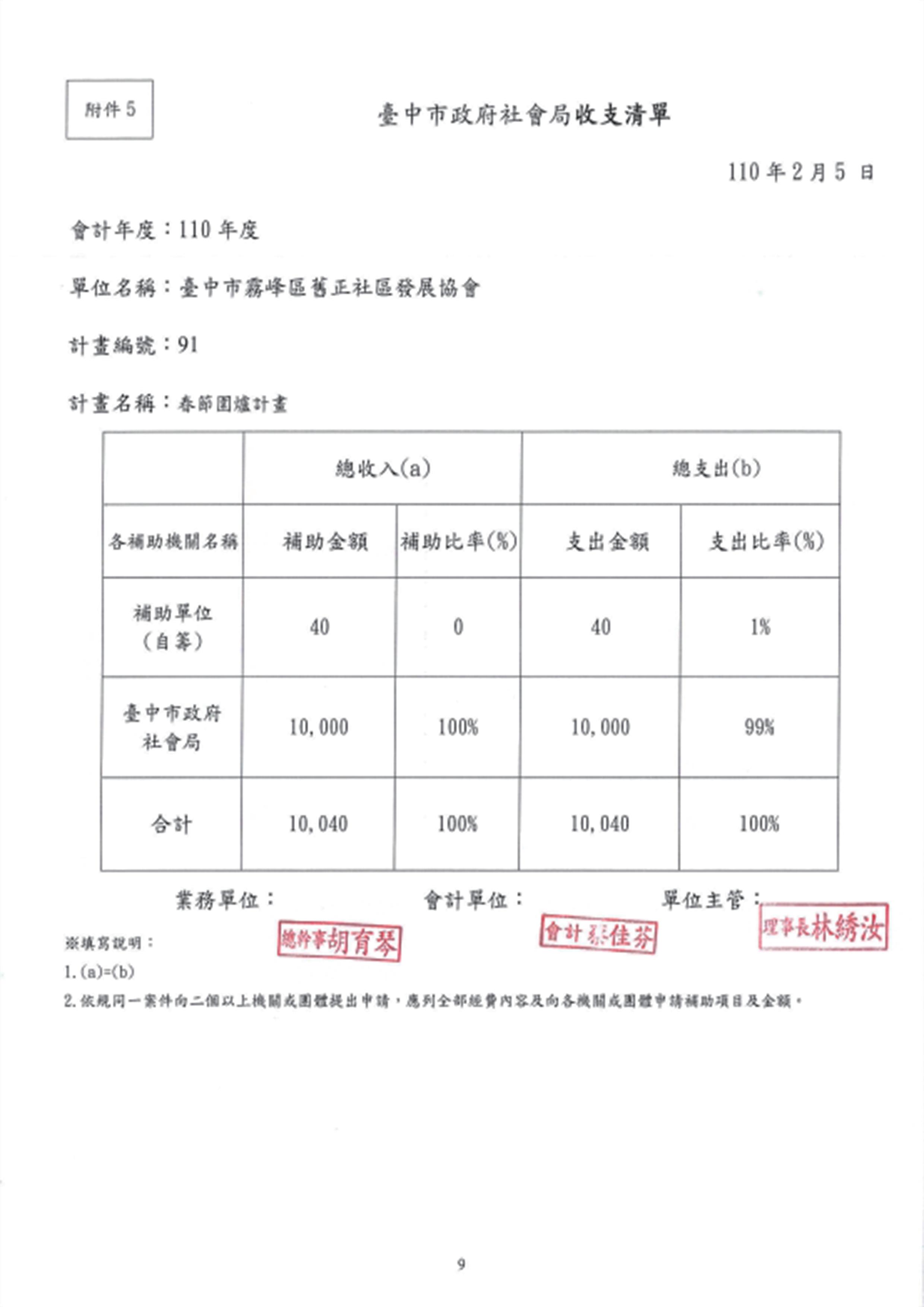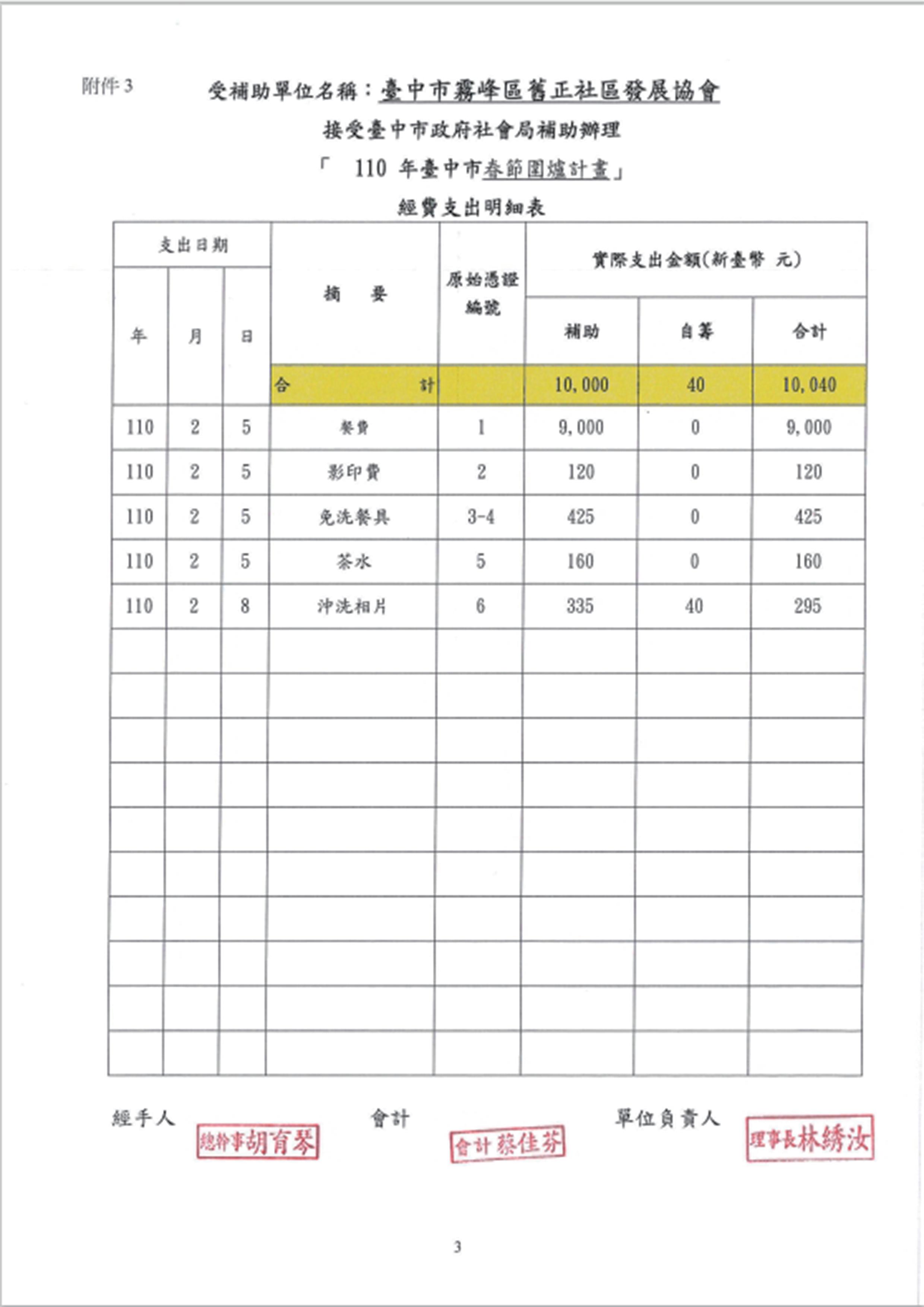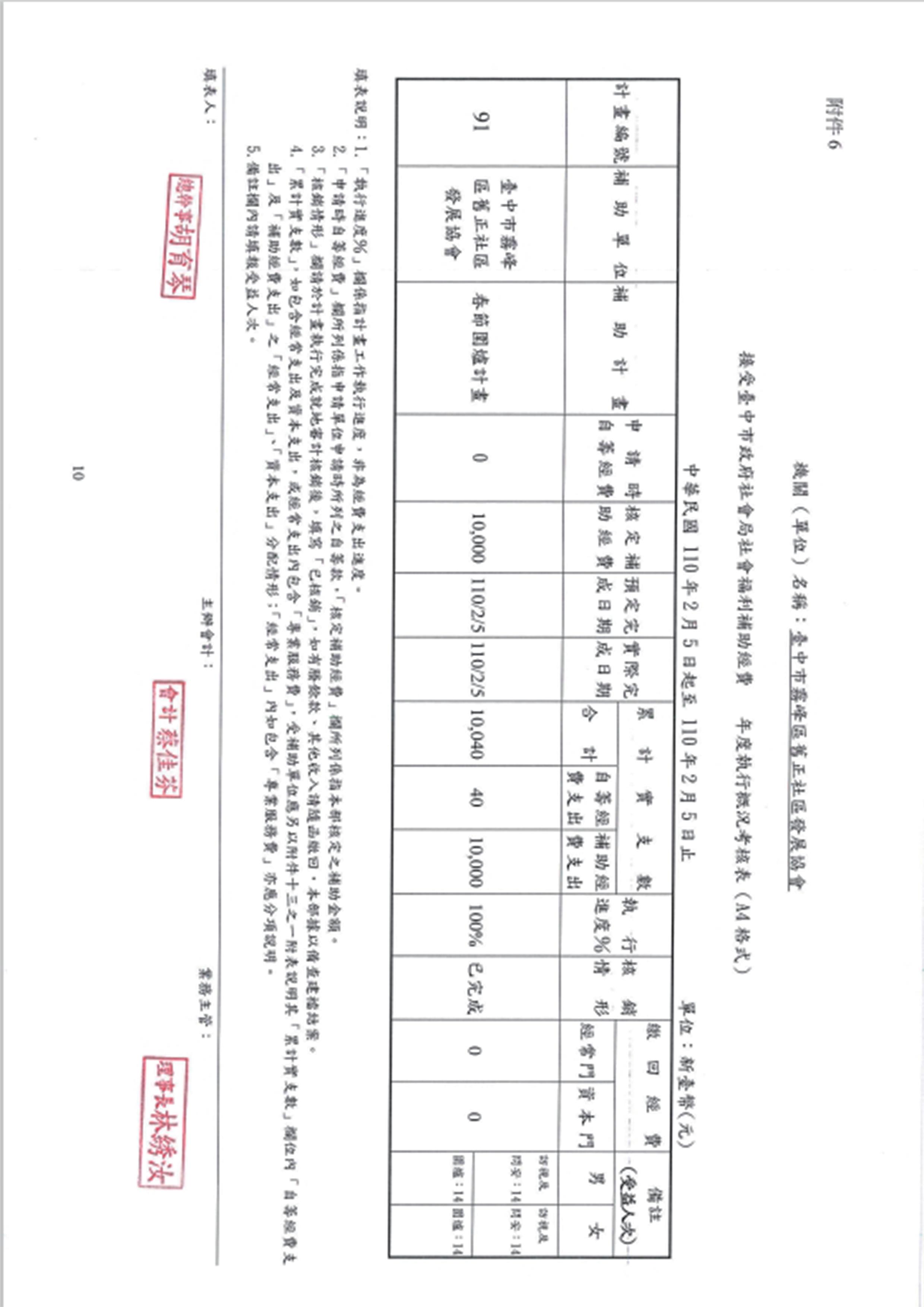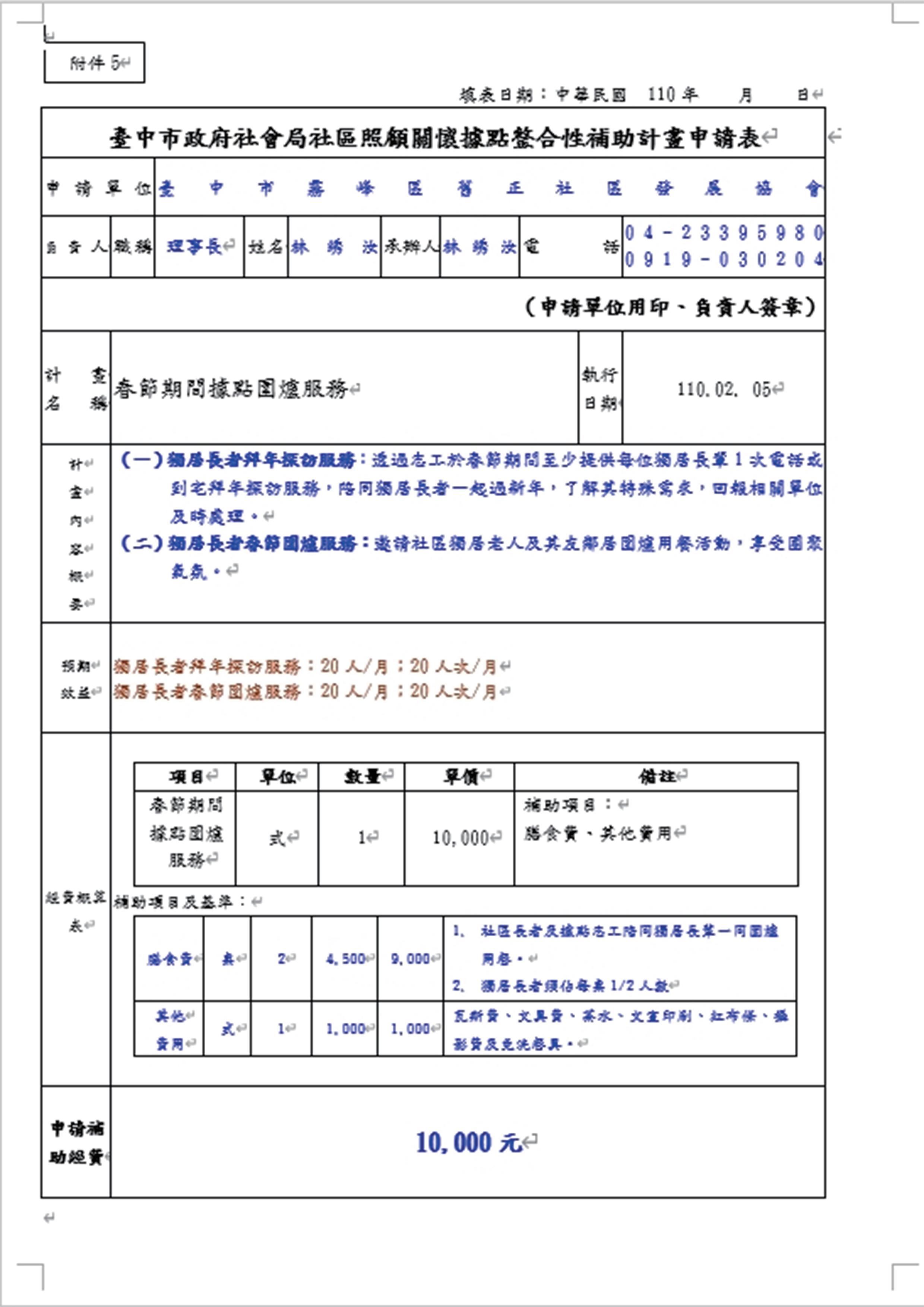 合計 10¸000 元,包括社會局補助 10¸000 元, 社區自籌款 0 元。
