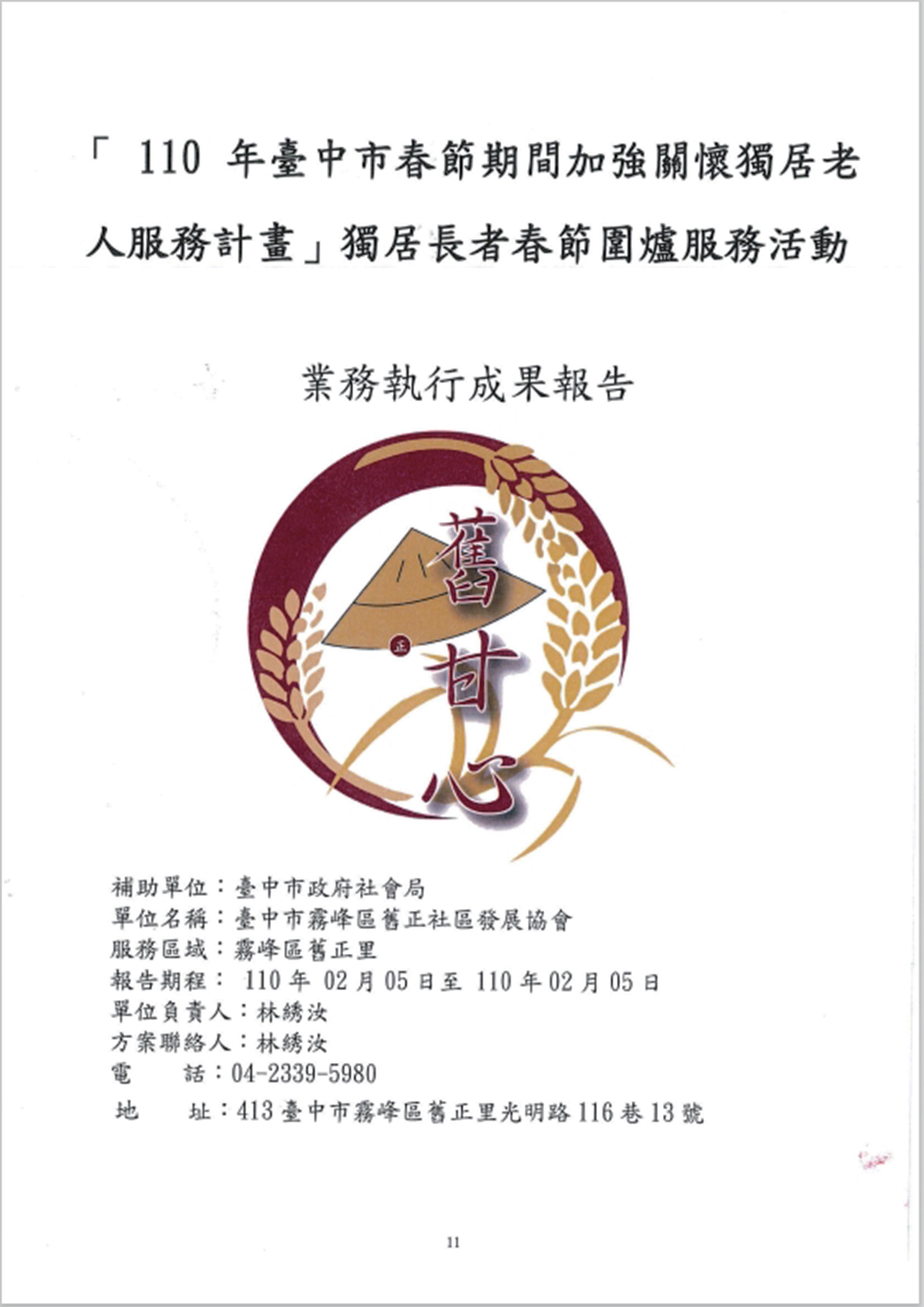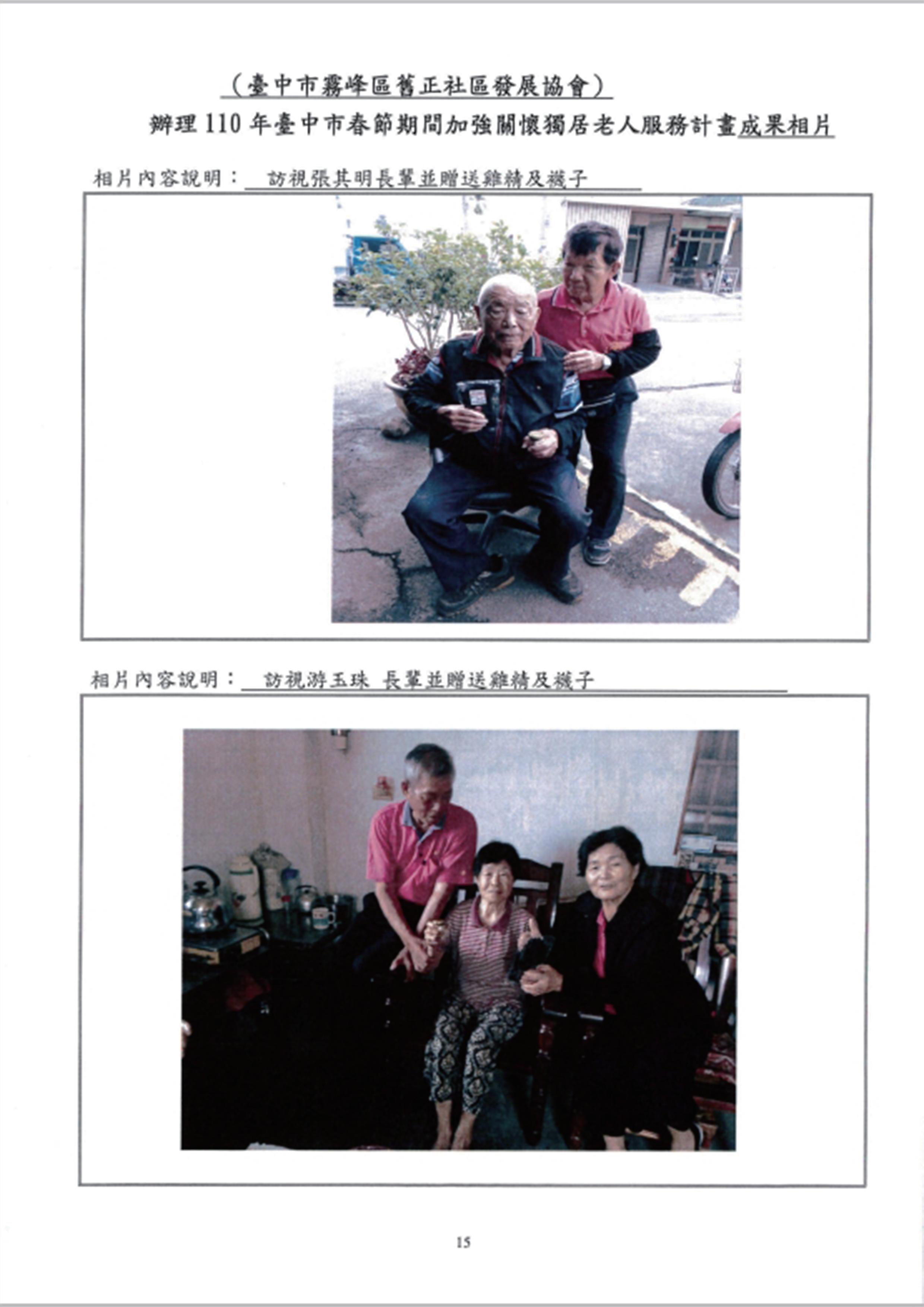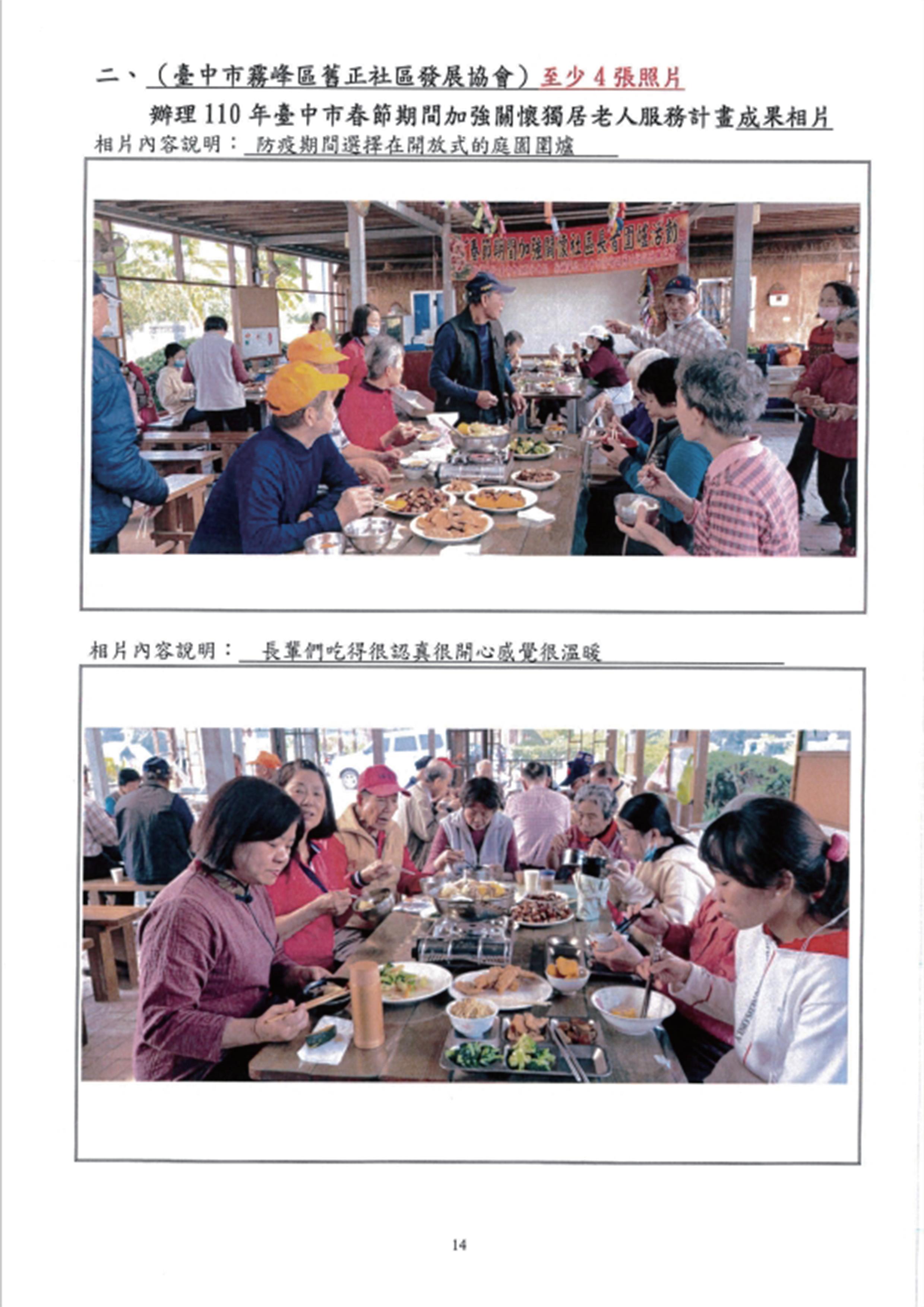 (二) 獨居長者春節圍爐服務:邀請社區獨居老人及其友鄰居圍 爐用餐活動,享受團聚氣氛。
