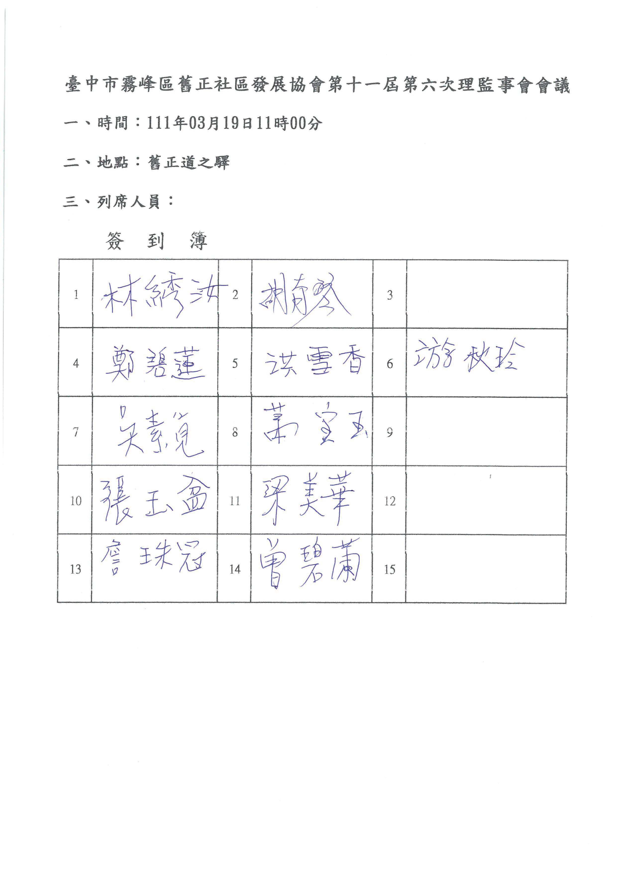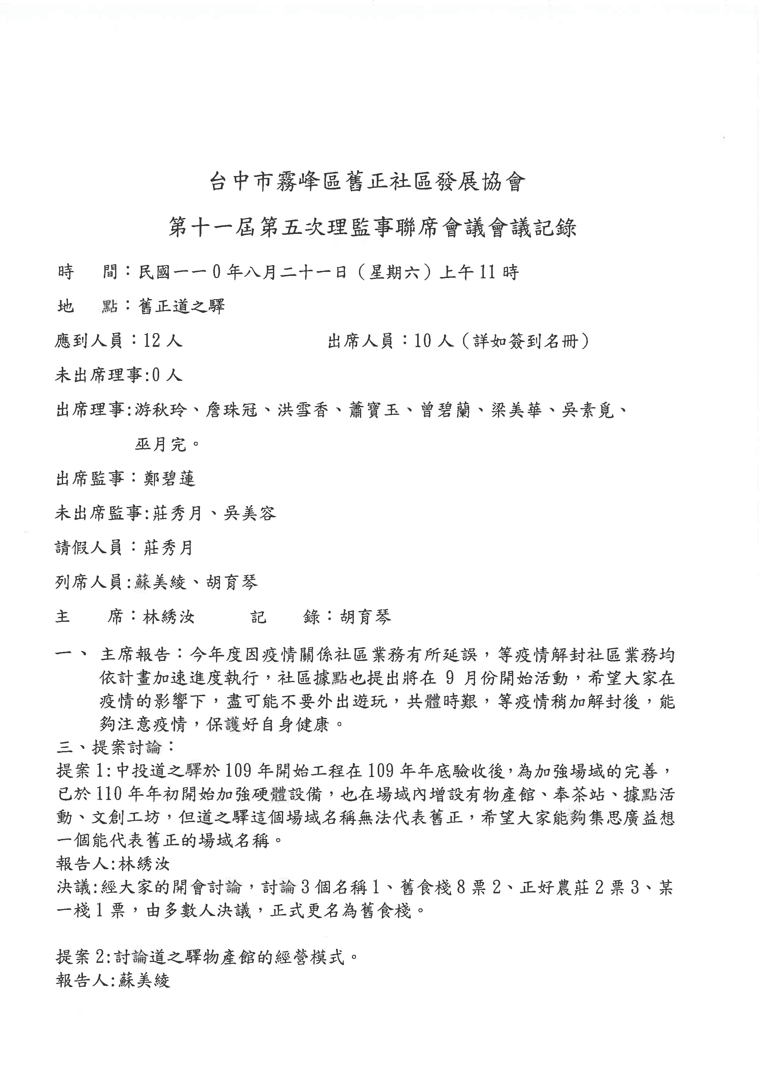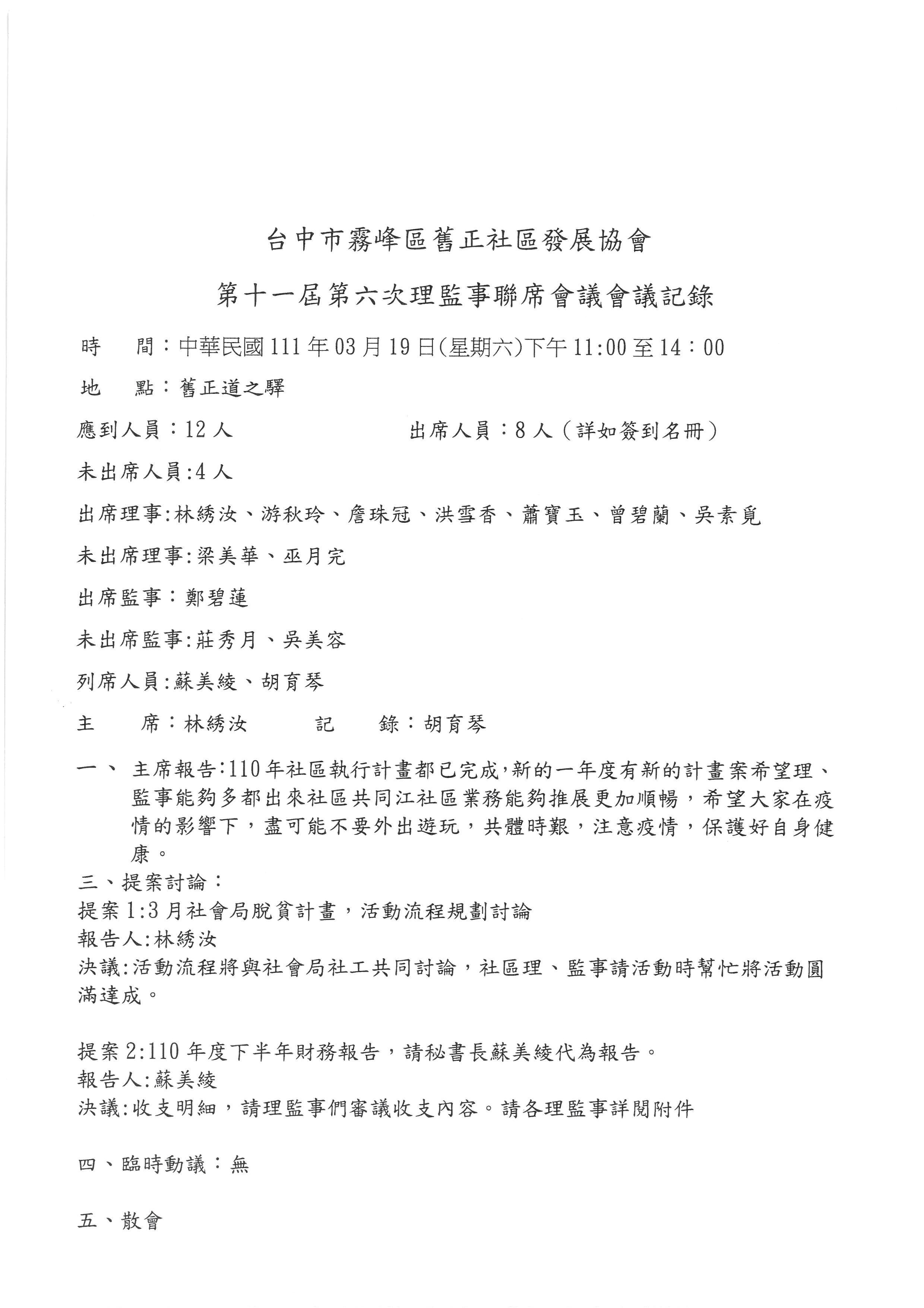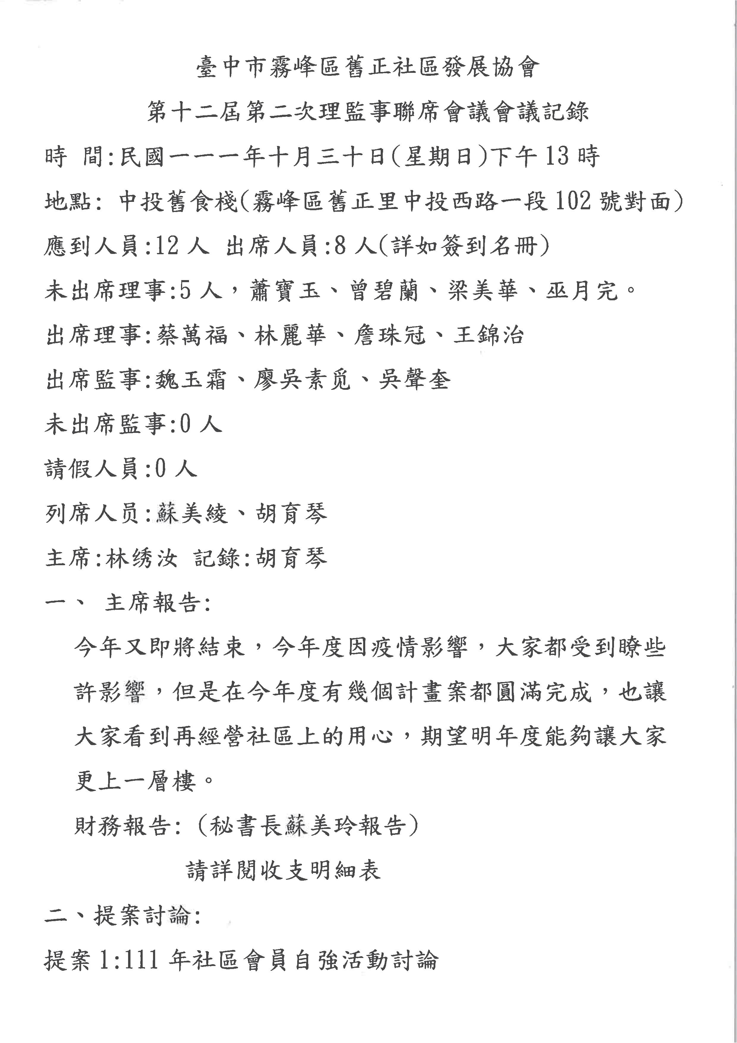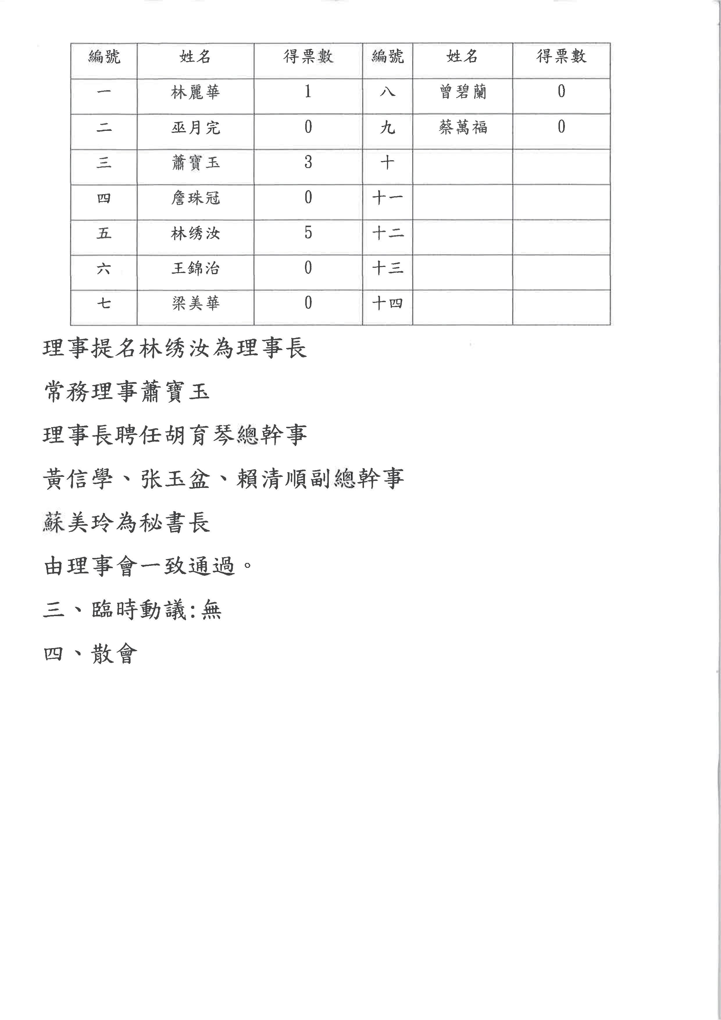 出席理事:林麗華、詹珠冠、王錦治、蕭寶玉、曾碧蘭、蔡 萬福、巫月完、梁美華。