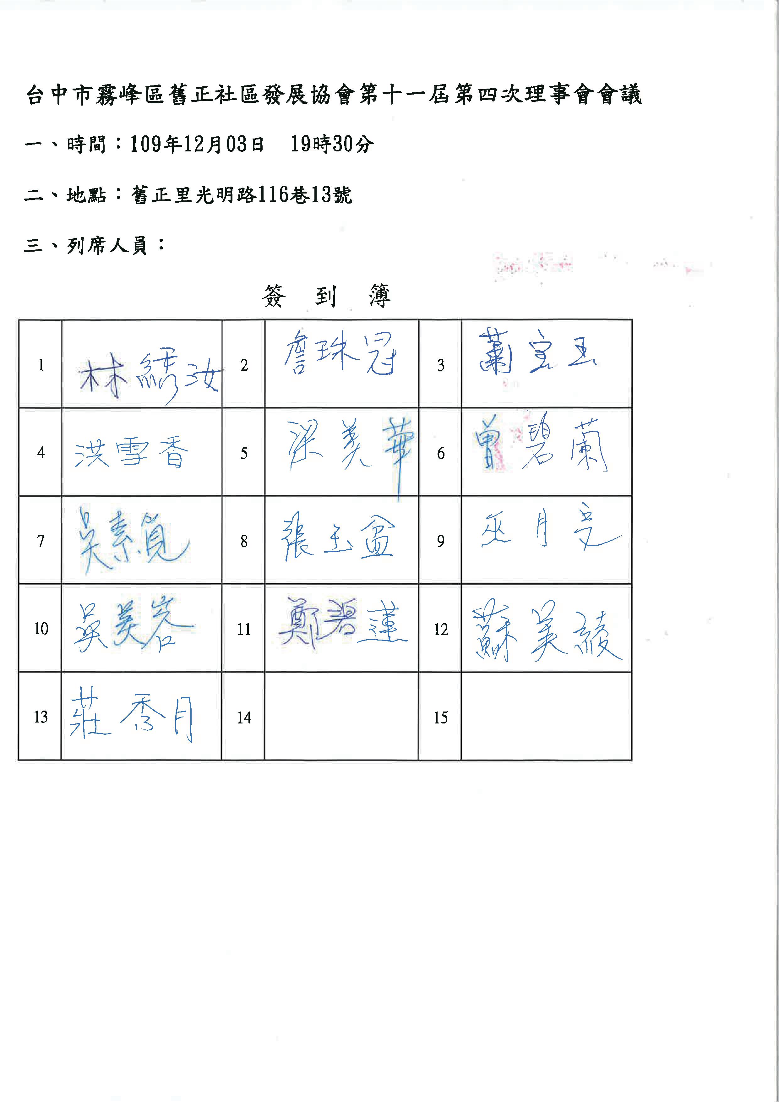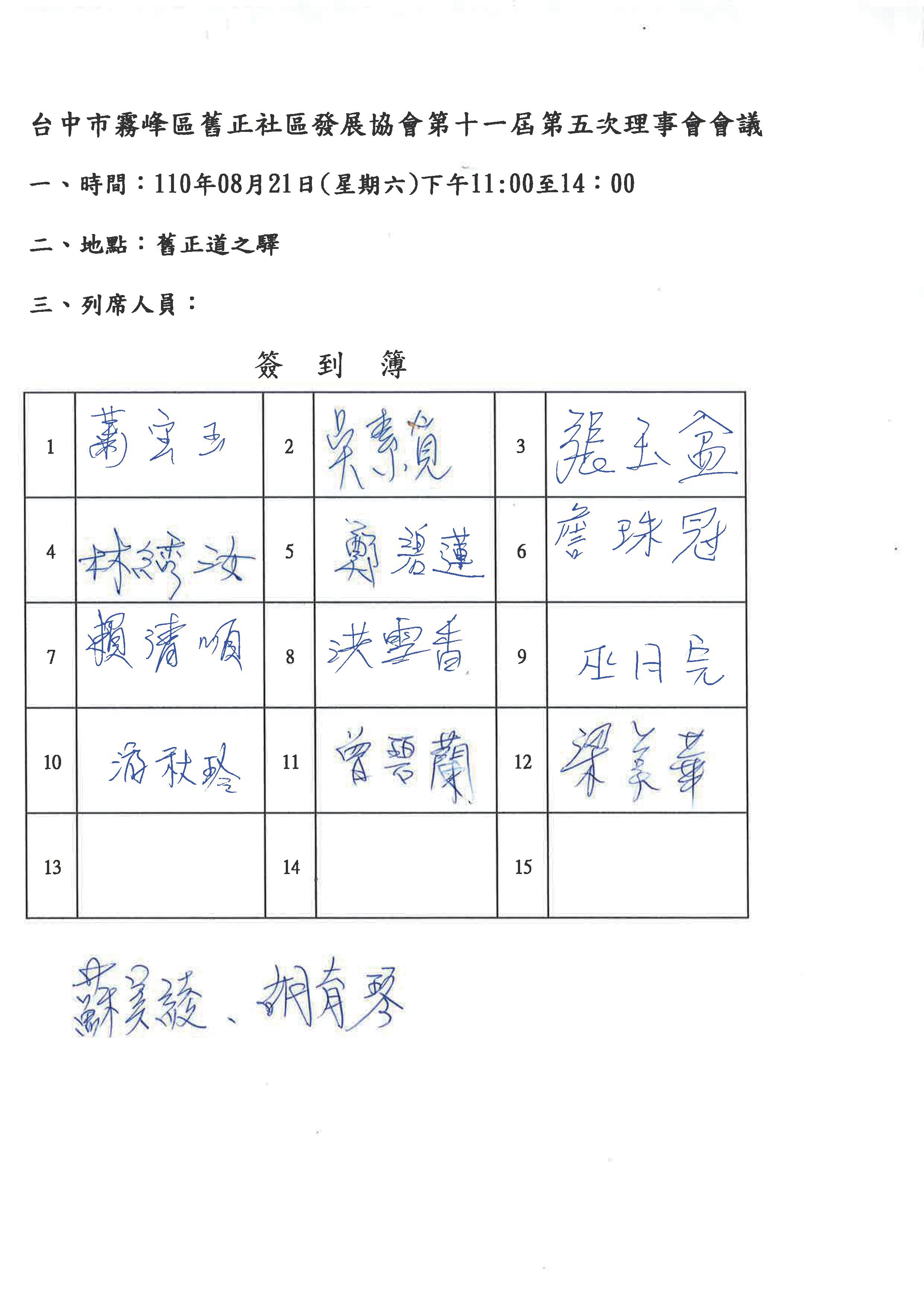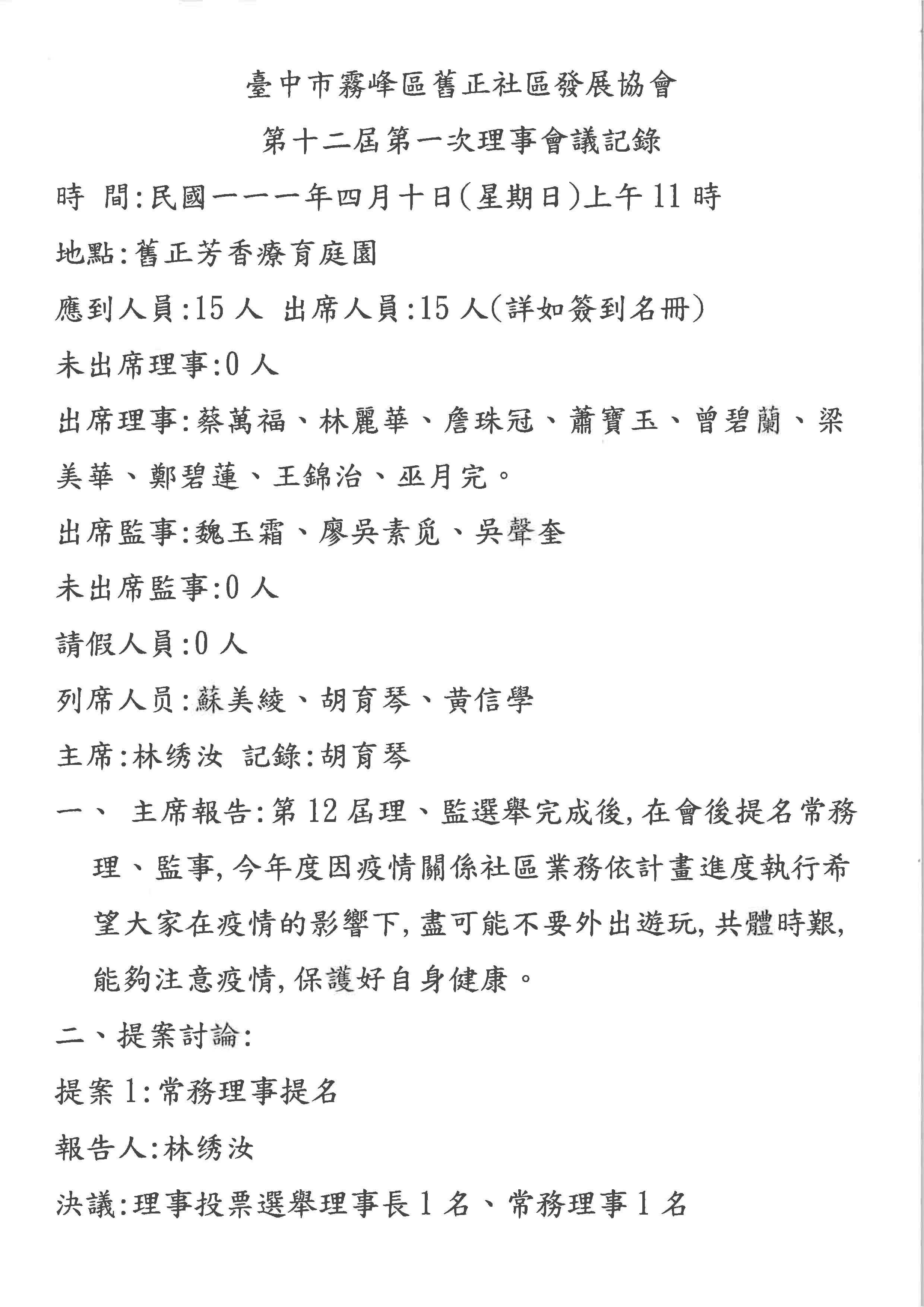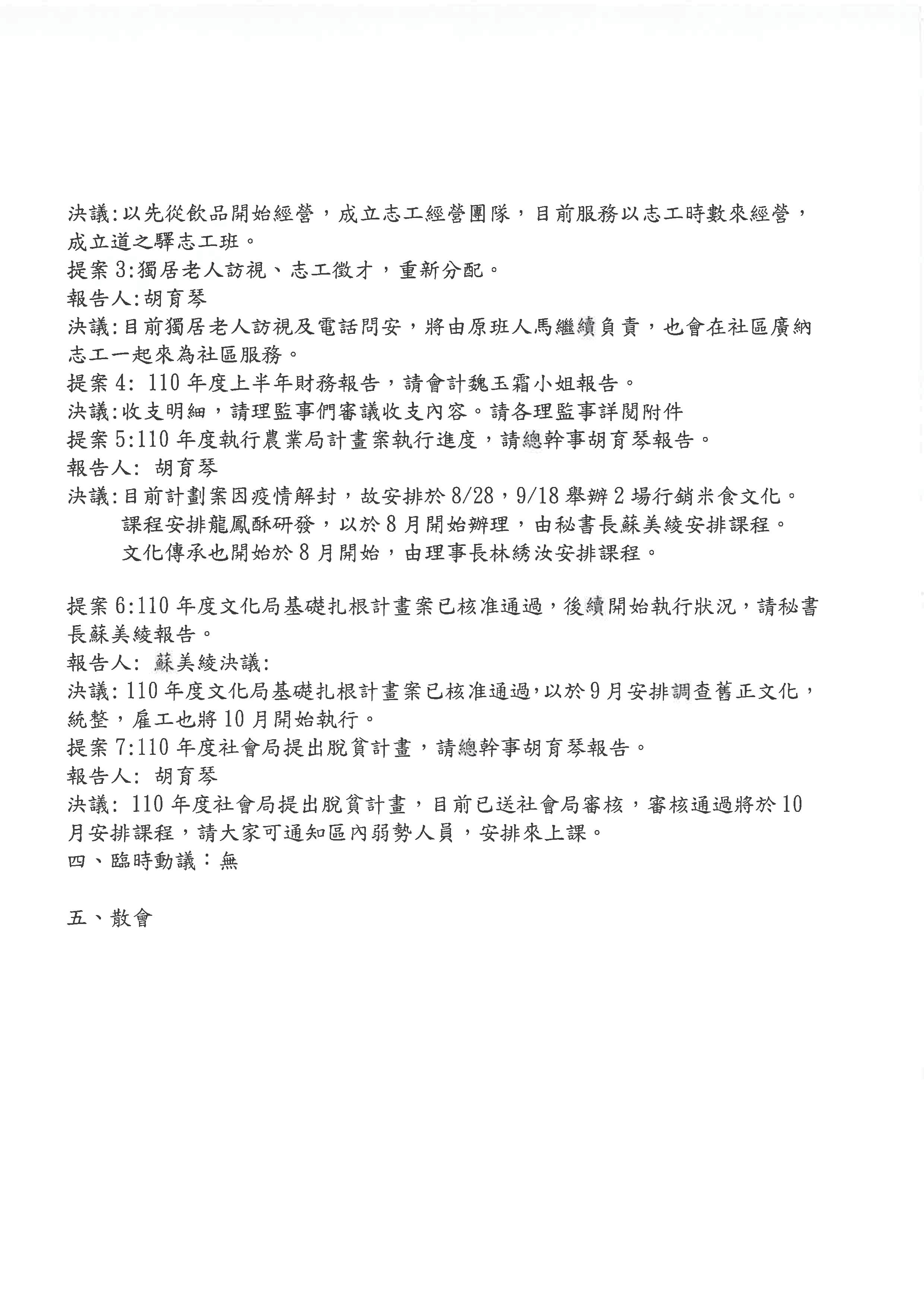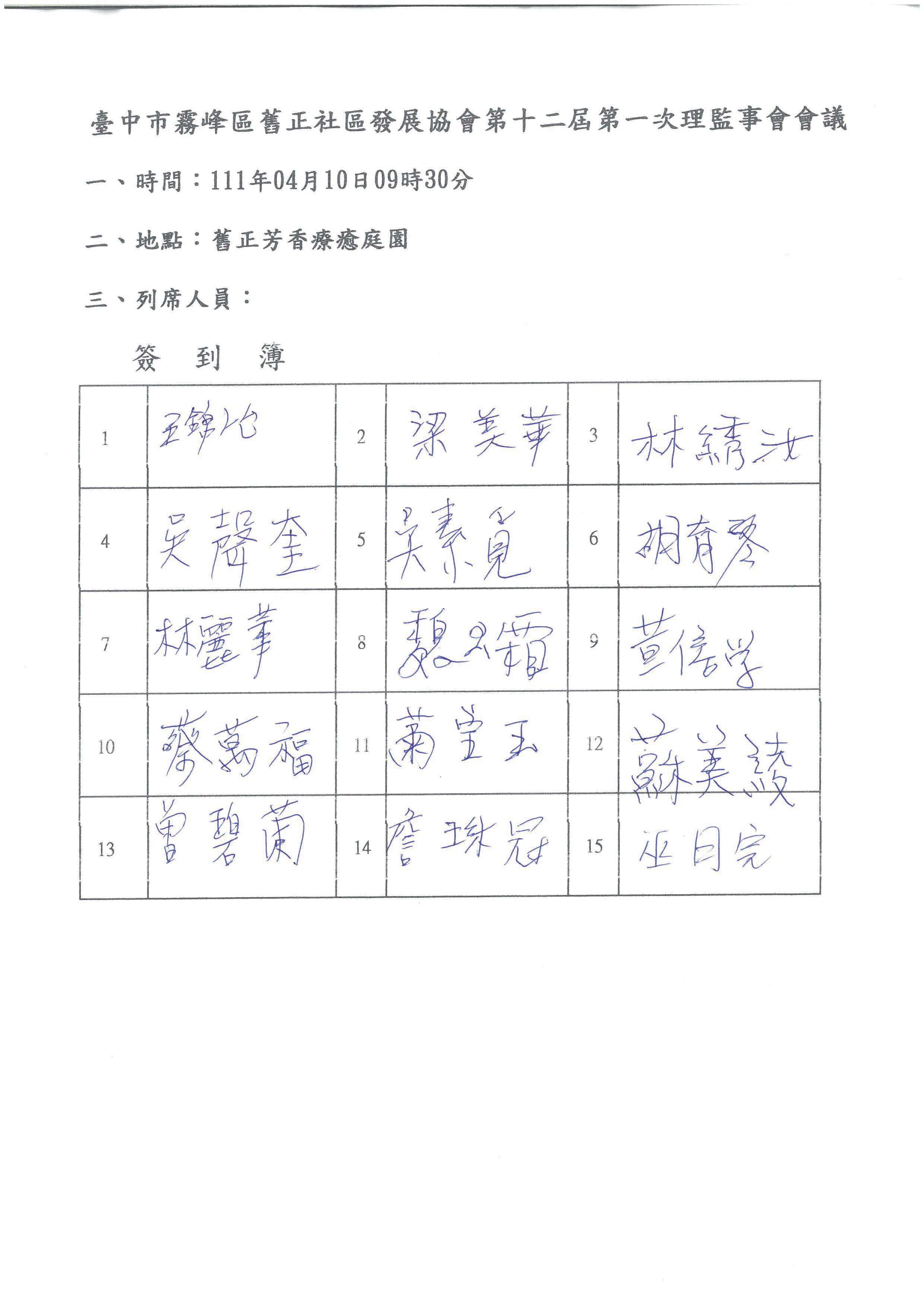 出席理事:林麗華、詹珠冠、王錦治、蕭寶玉、曾碧蘭、蔡 萬福、巫月完、梁美華。