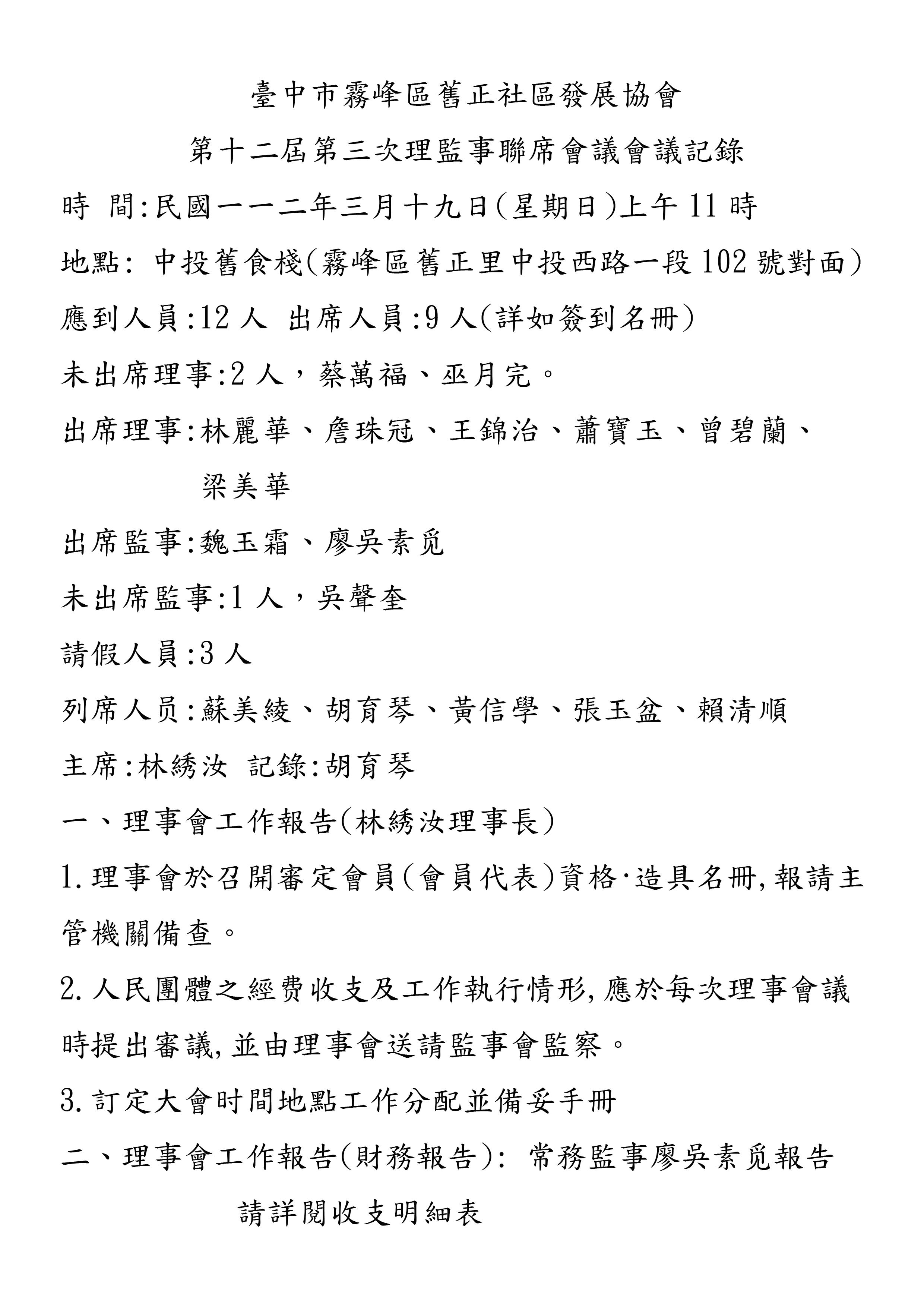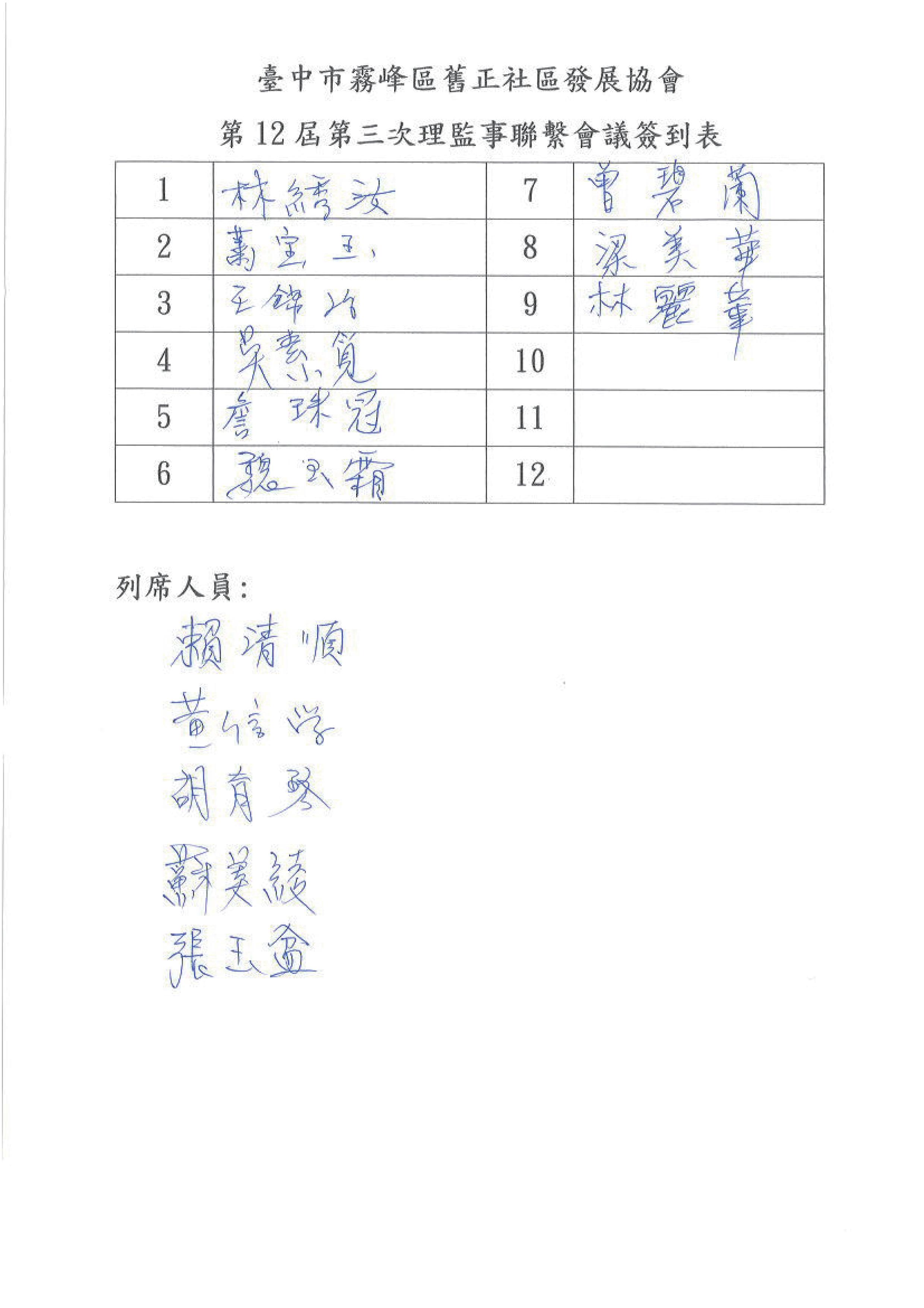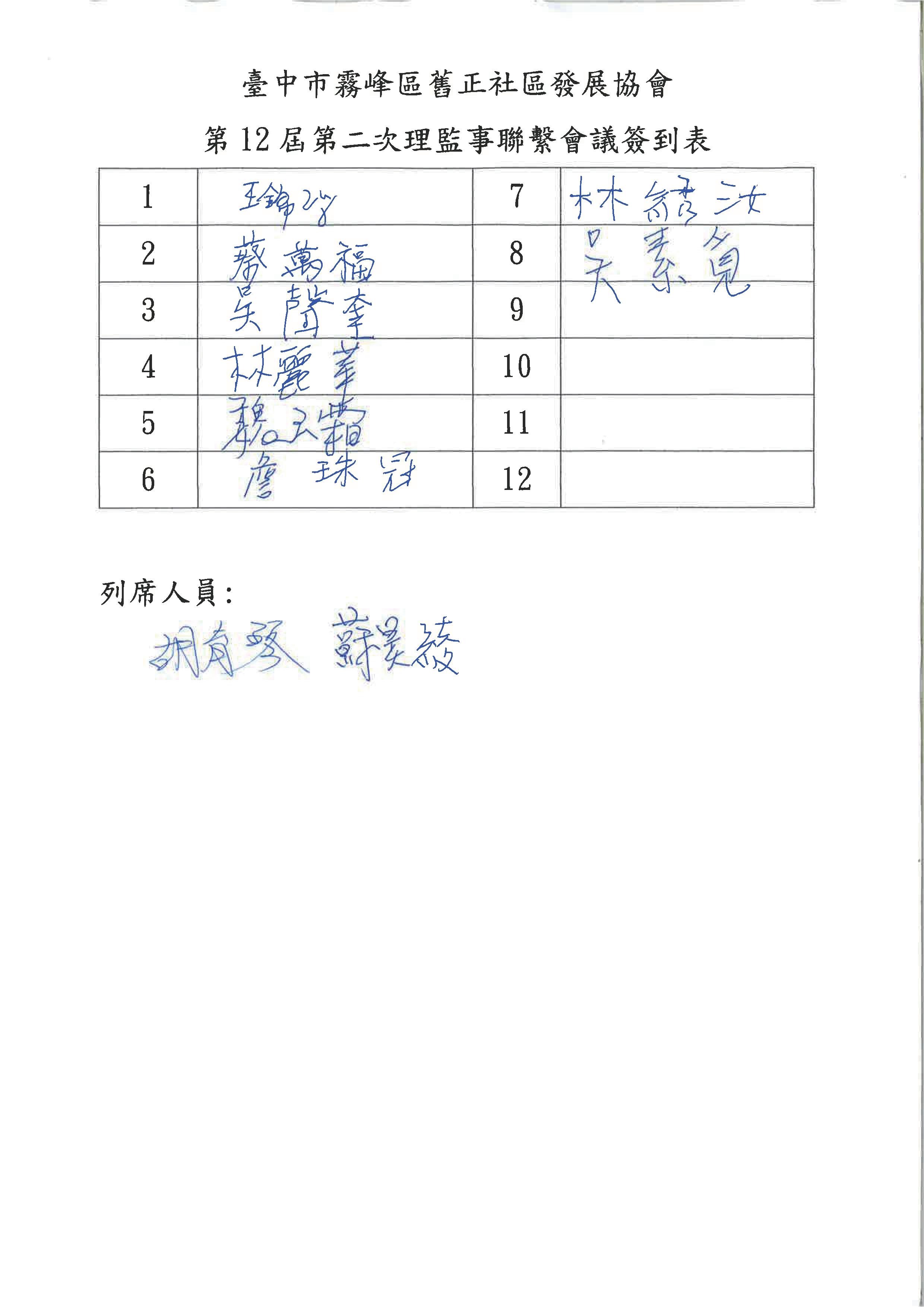 應到人員:12 人 出席人員:12 人(詳如簽到名冊)