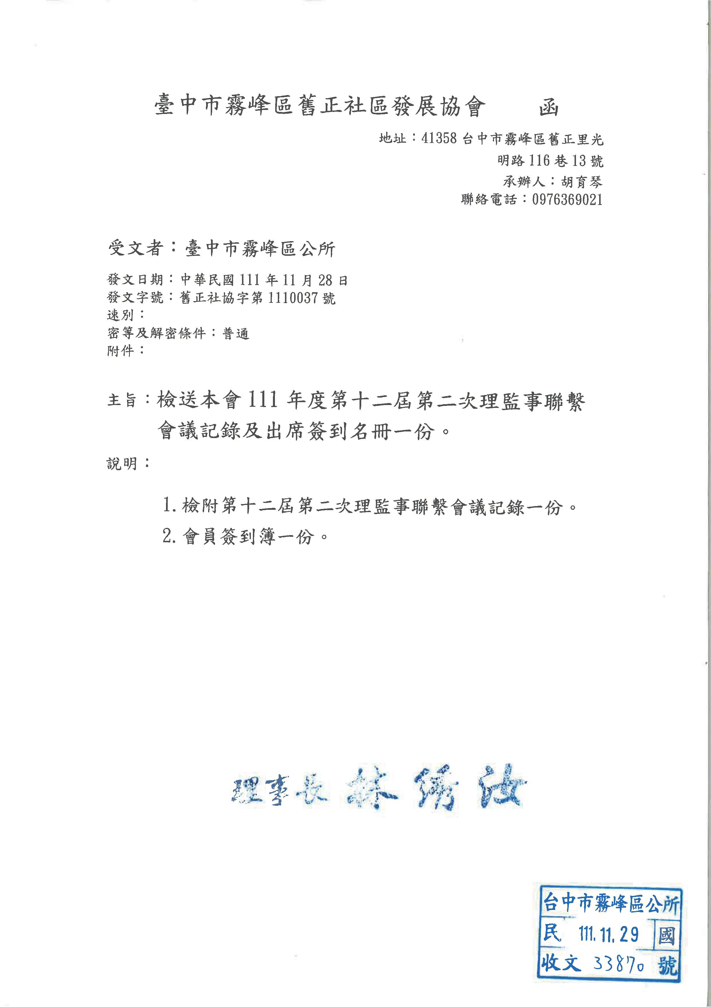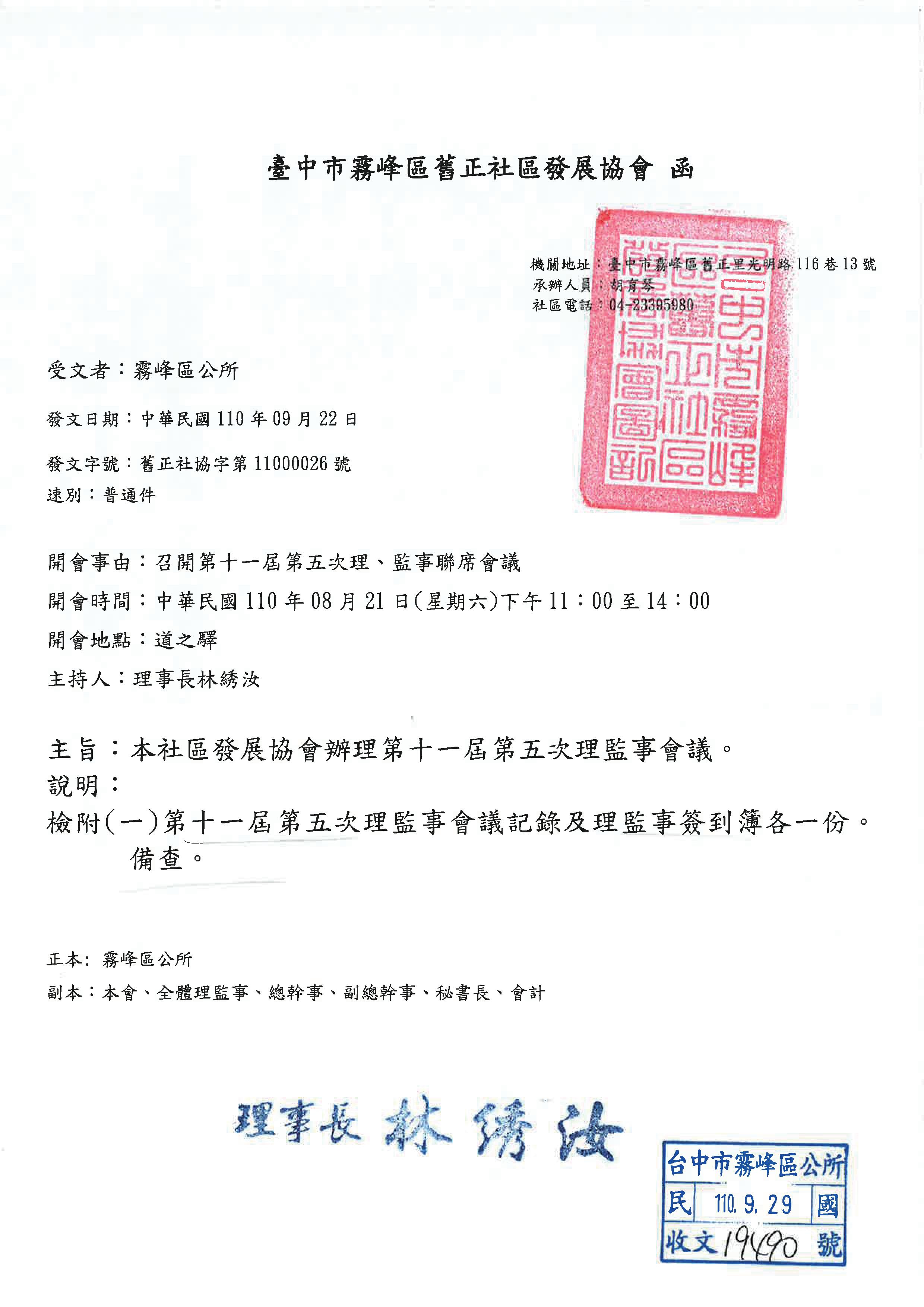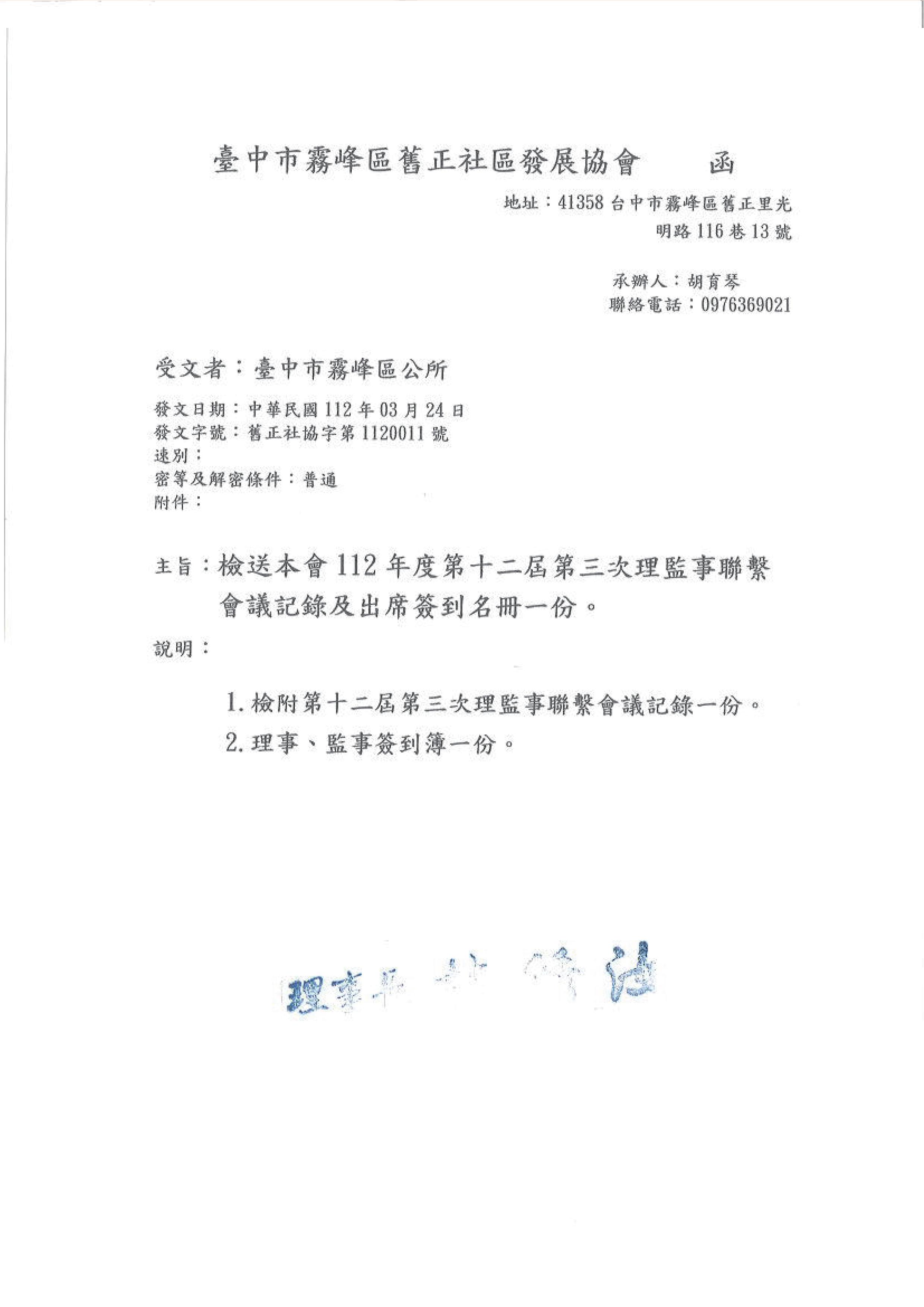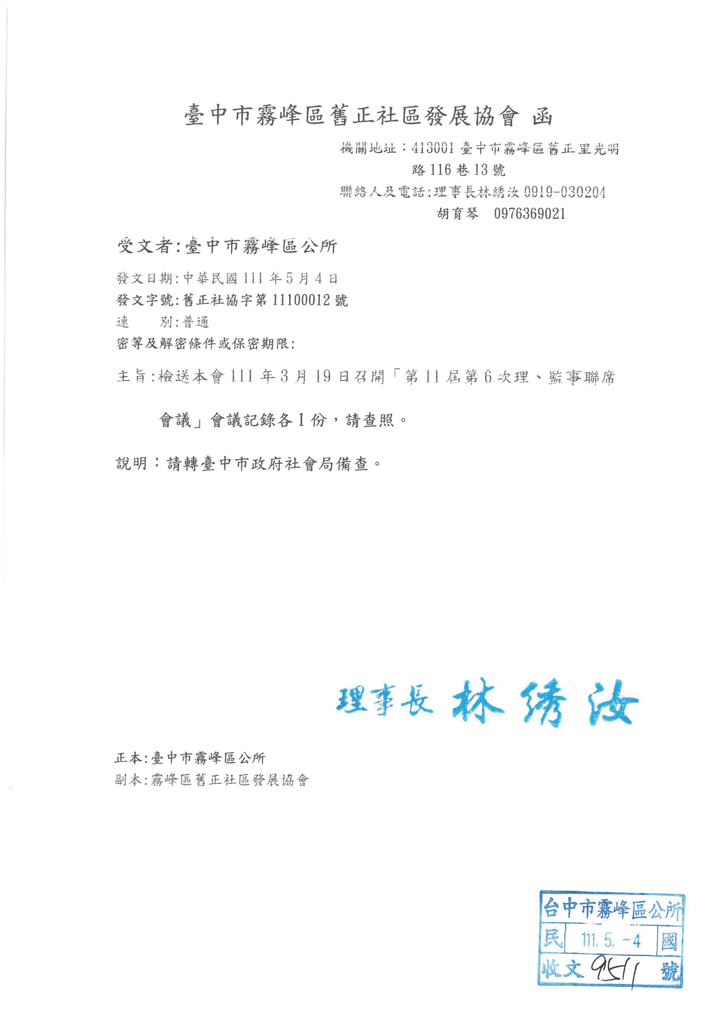 發文日期:中華民國 112 年 09 月 18 日 發文字號:舊正社協字第 1120035 號 速別: