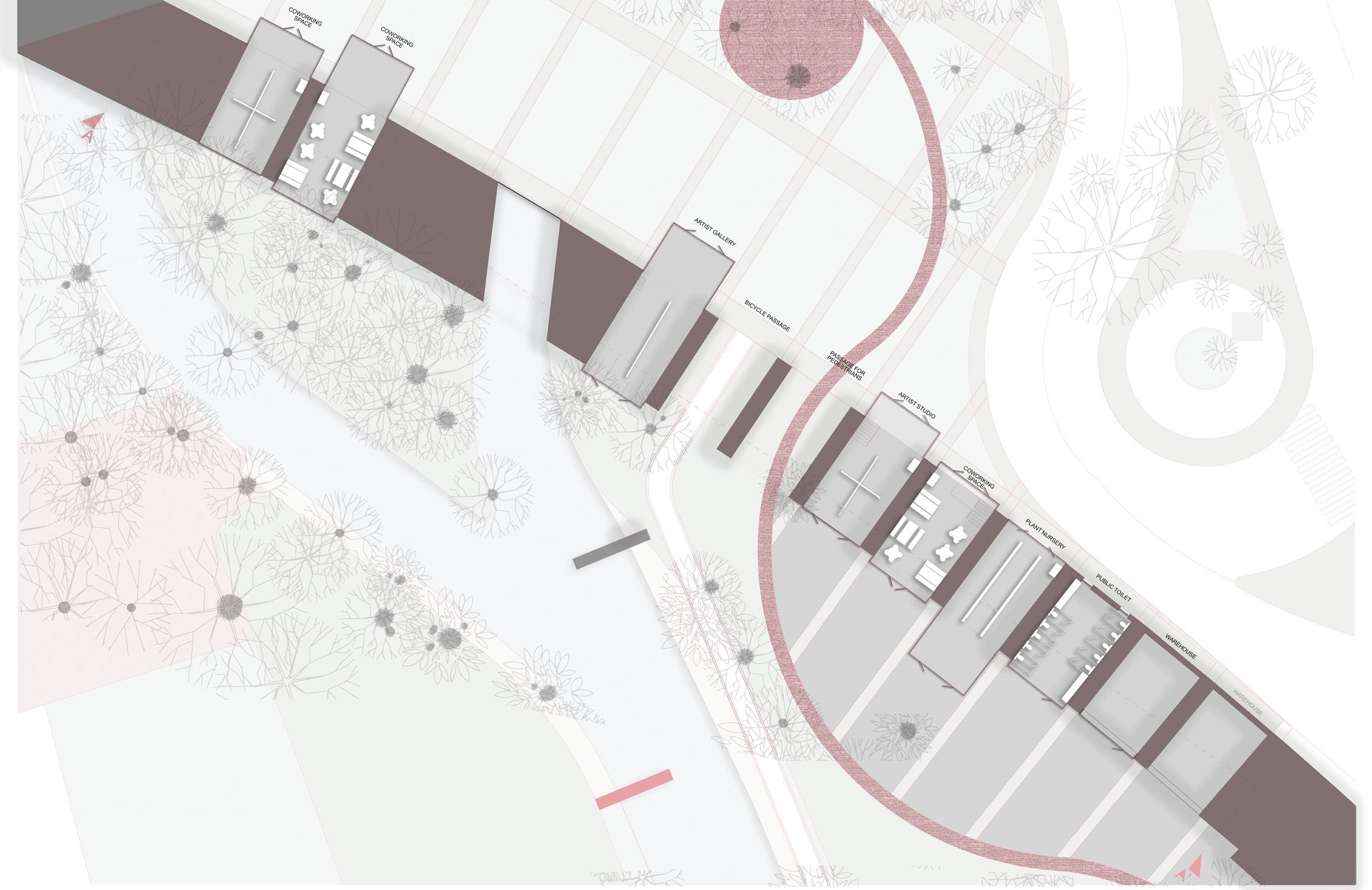 The project is perceived as an ever growing idea, morphing the space around it as an efficient and resourceful intervention. To highlight the ever growing nature of the design, the current proposal is Phase one of three phases where the area includes the arches and its surroundings to the streets of Via Malaga and culminating at the Piazza Bilbao. This in its further stages will be continuing all the way to join the brown land on the north of the site across the Naviglio Grande on one side and connects the green belt down south leading to Parcho Giochi.