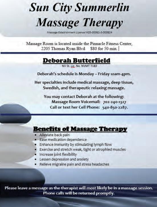 The Link is the official record of Sun City Summerlin Community Association, Inc. The primary mission of the magazine is to provide residents with information on official Association business. In addition, the Link provides unbiased communications to residents on community news, events and services. The Association provides this publication for informational purposes only and neither endorses nor promotes any of the products or services advertised herein and assumes no responsibility or liability for the statements made in this publication. We reserve the right to edit, condense and verify all articles.